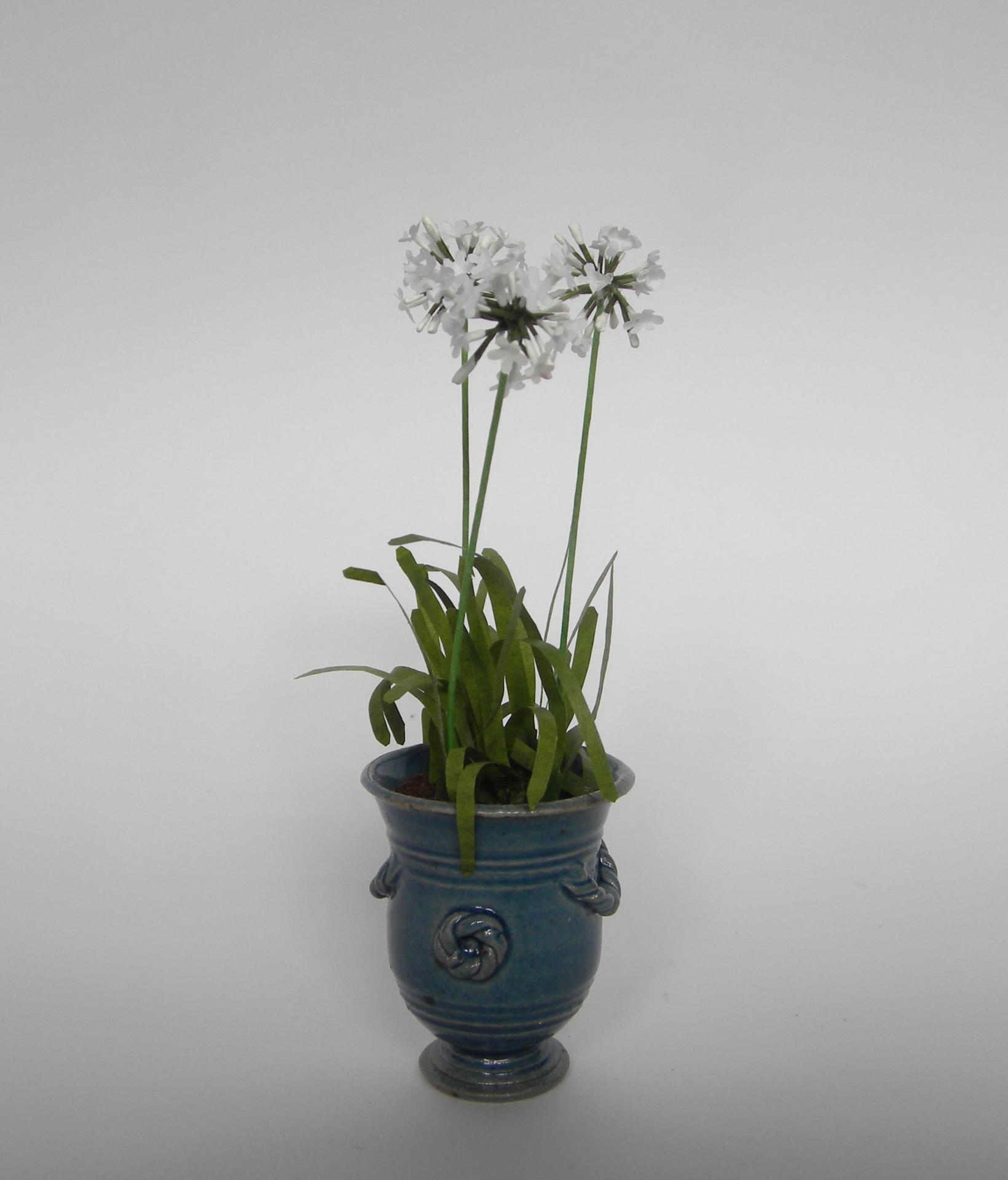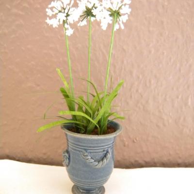 Agapanthe blanc miniature dans un magnifique vase d'Anduze bleu créé par Elisabeth Causeret