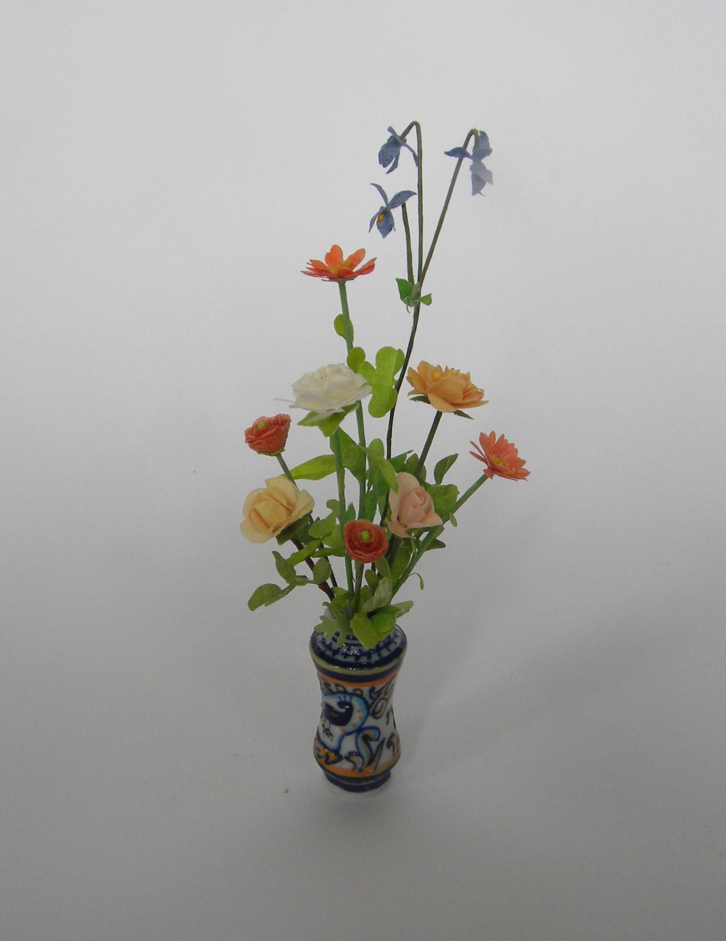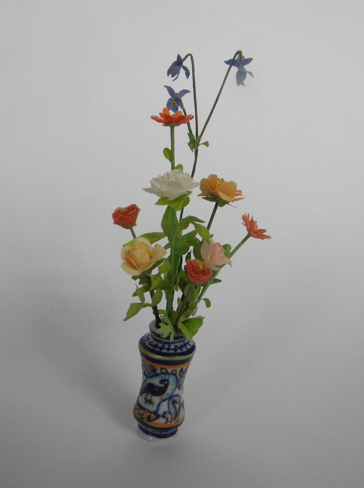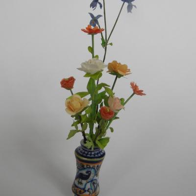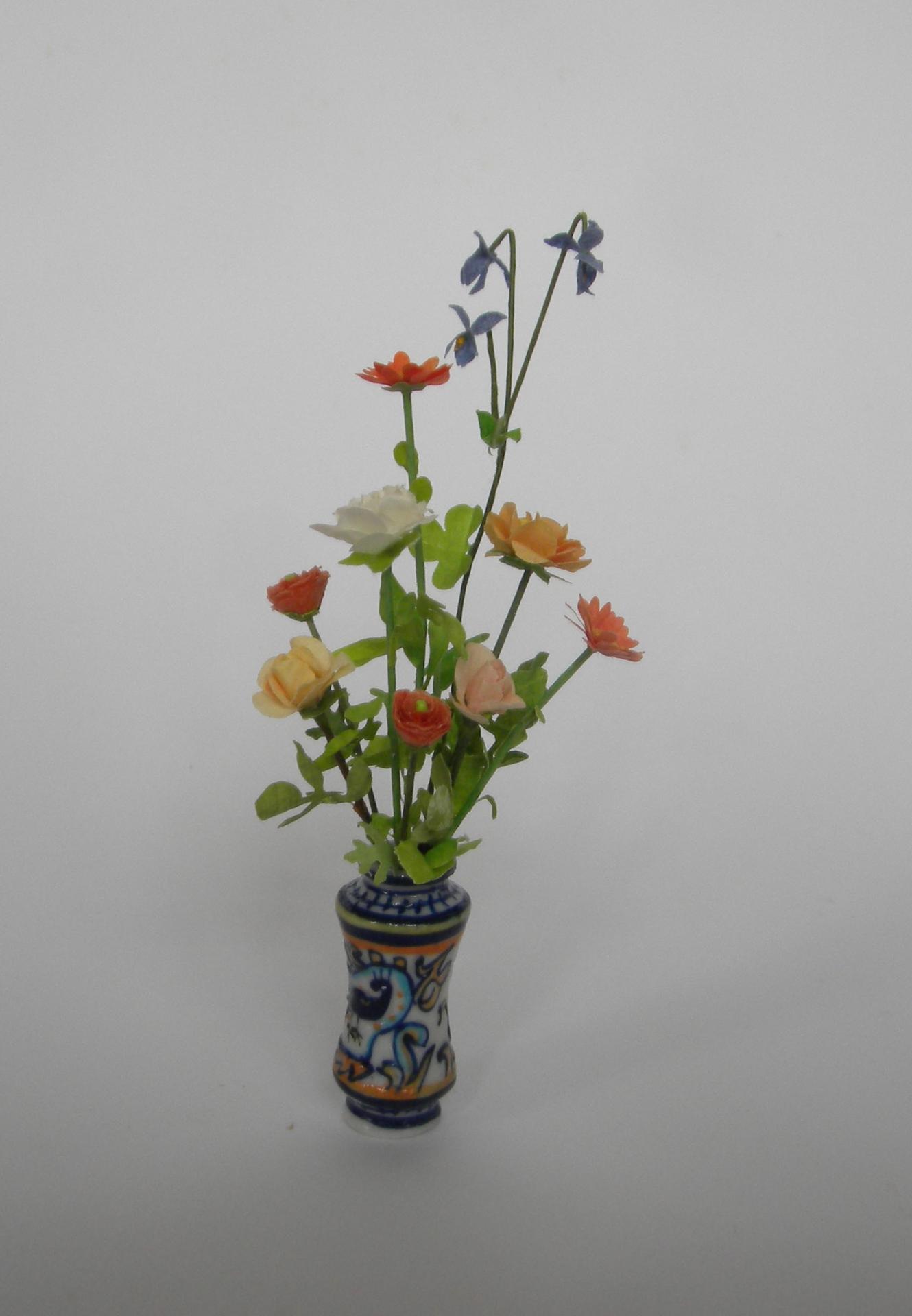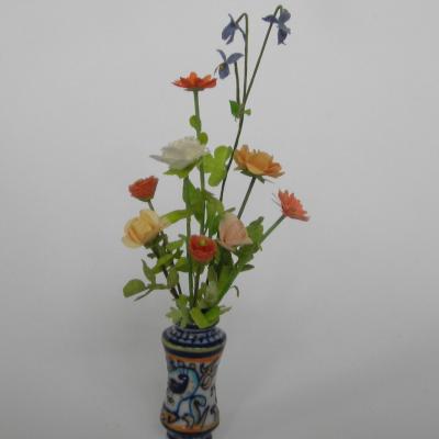 Petit bouquet miniature composé de roses , renoncules , souci et ancolie bleue clair dans un petit vase en faience dans le style italien
