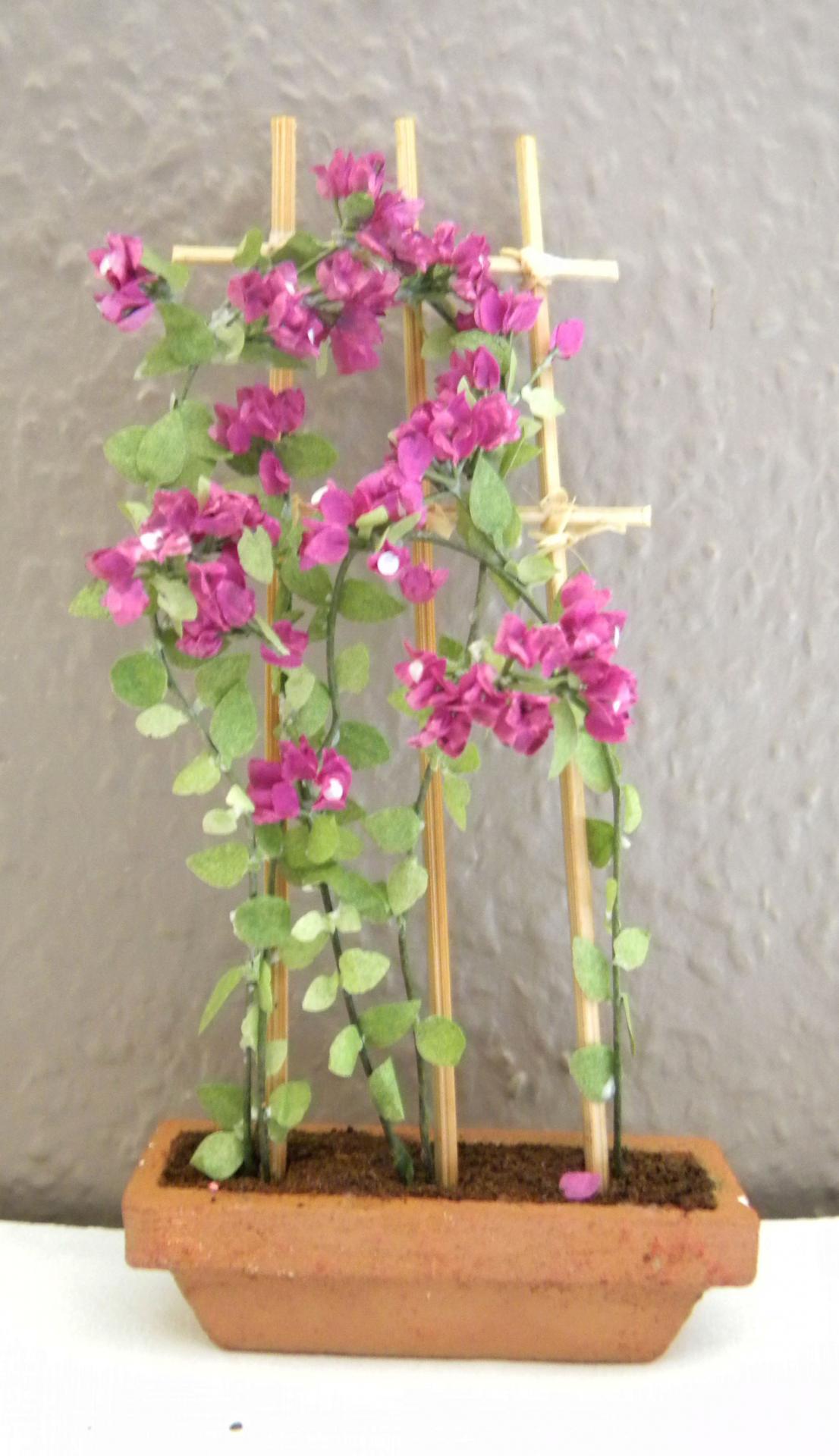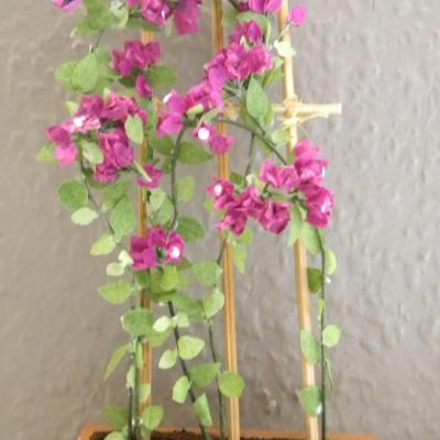 Bougainvillée miniature à fleurs roses soutenu palissé sur un treillis en bois naturel dans une jardinière en terre cuite