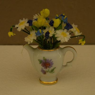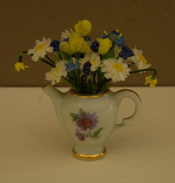 Petit bouquet miniature composé de marguerites , jonquilles , myosotis et tulipes dans une thière en porcelaine de Limoges à décor fleuri datant du début du XX° siècle ( avec son chapeau )