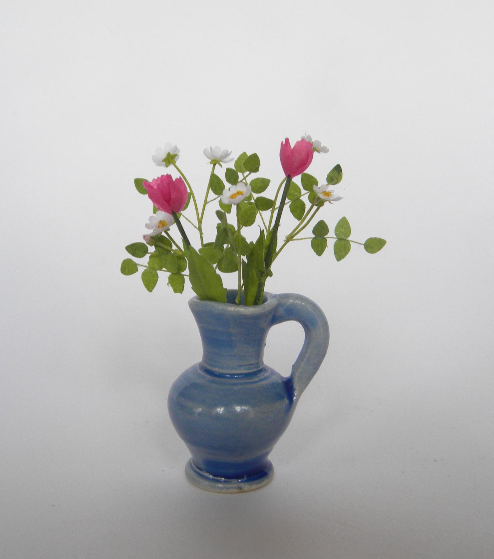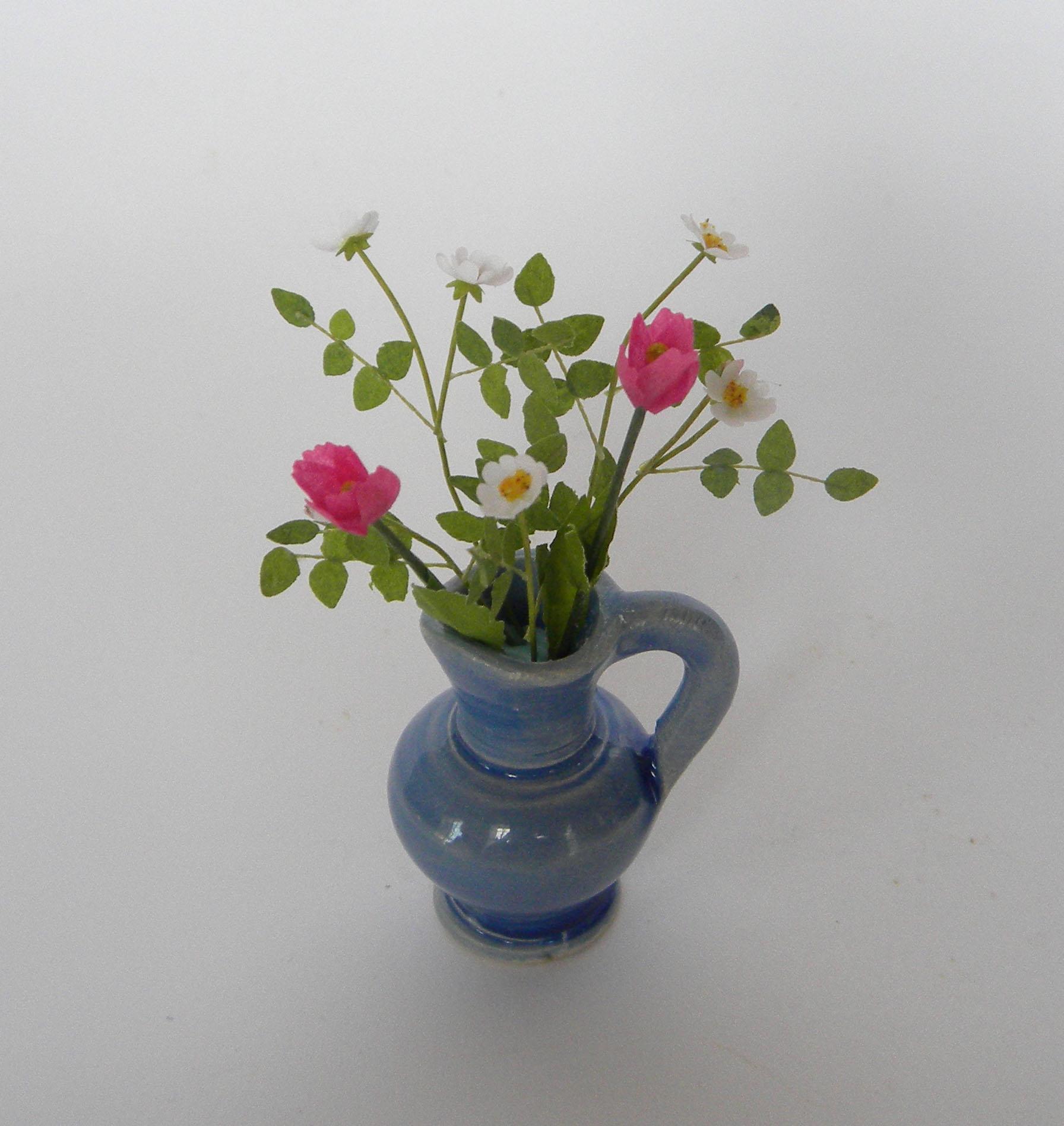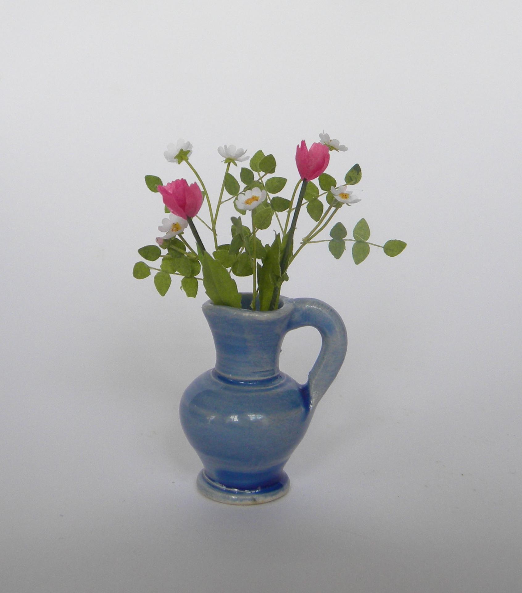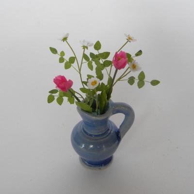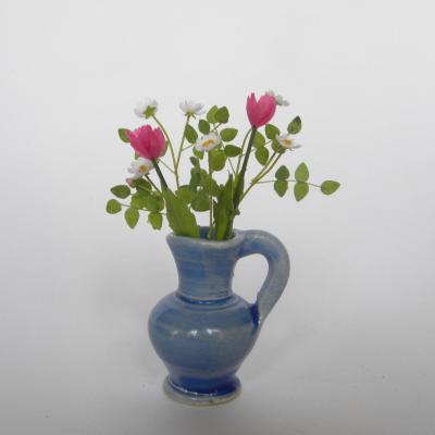 Très printanier bouquet miniature d'églantines et de tulipes roses dans un vase en faience bleue