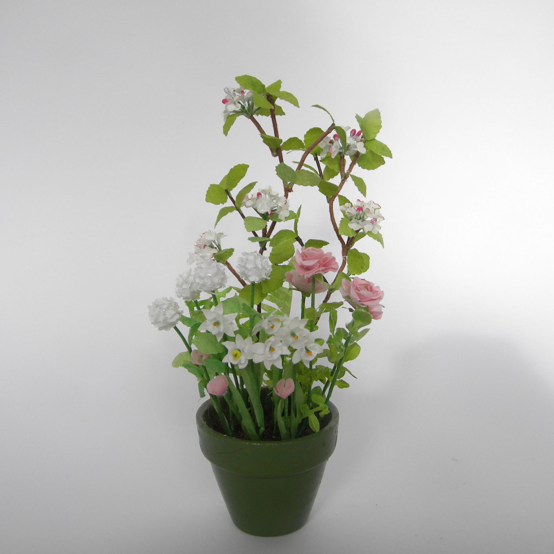 Très beau bouquet miniature de fleurs de printemps avec une grande branche de viorne , des boules de neiges , des roses roses , des narcisses et de petites tulipes dans ungrand vase en terre cuite vert