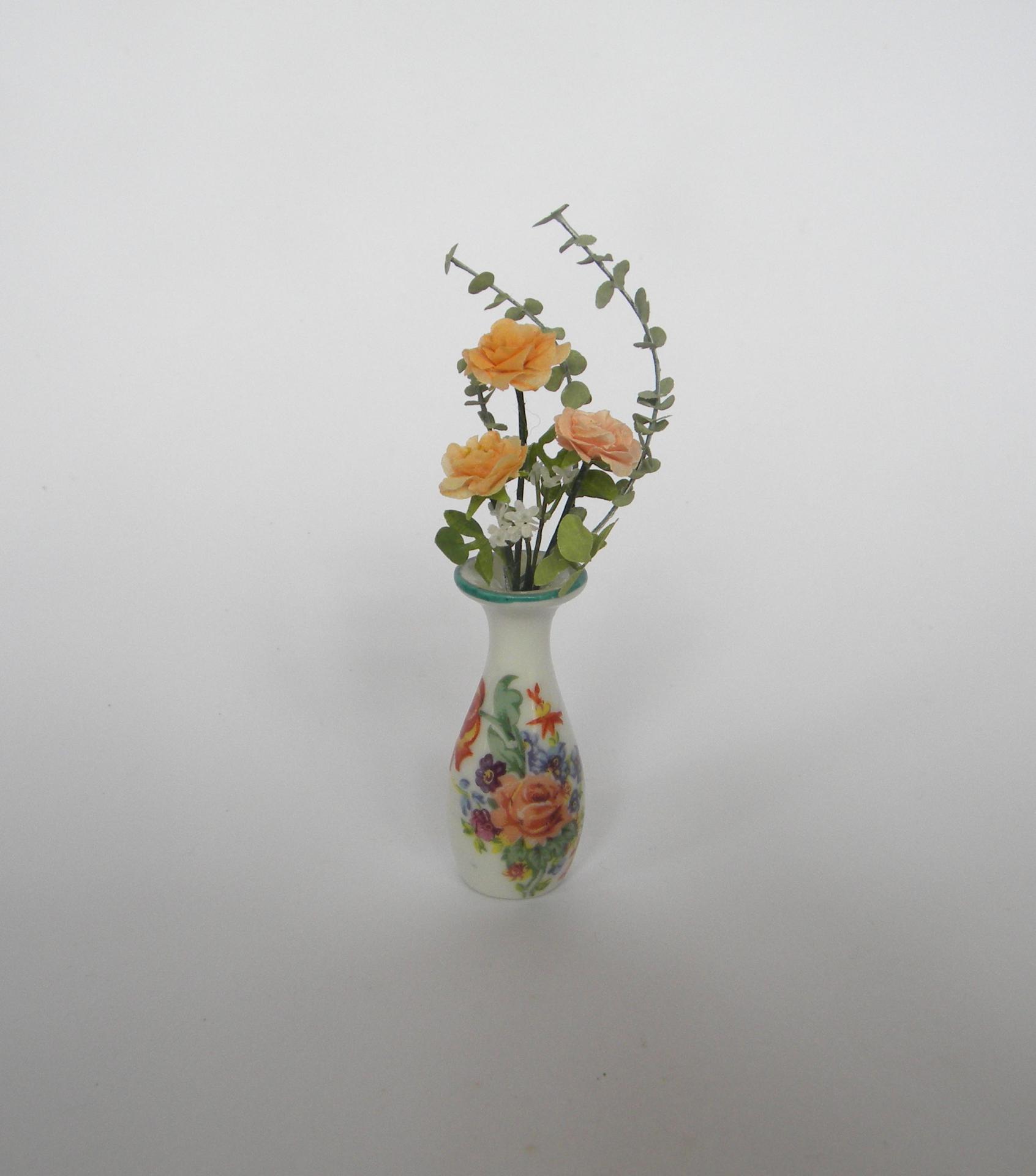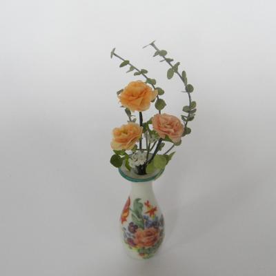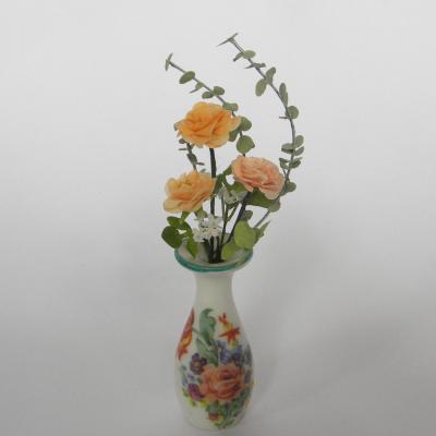 Très élégant bouquet de fleurs miniatures composé de roses saumon et de branches d'eucalyptus dans un vase en Limoges ancien datant du XIX° siècle