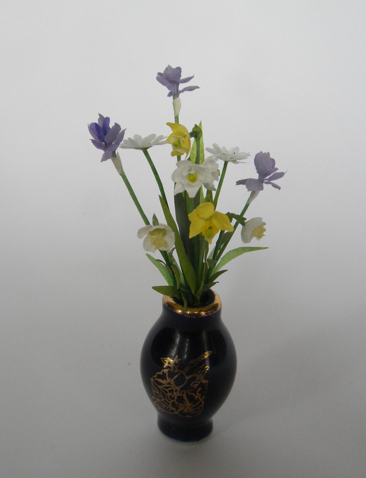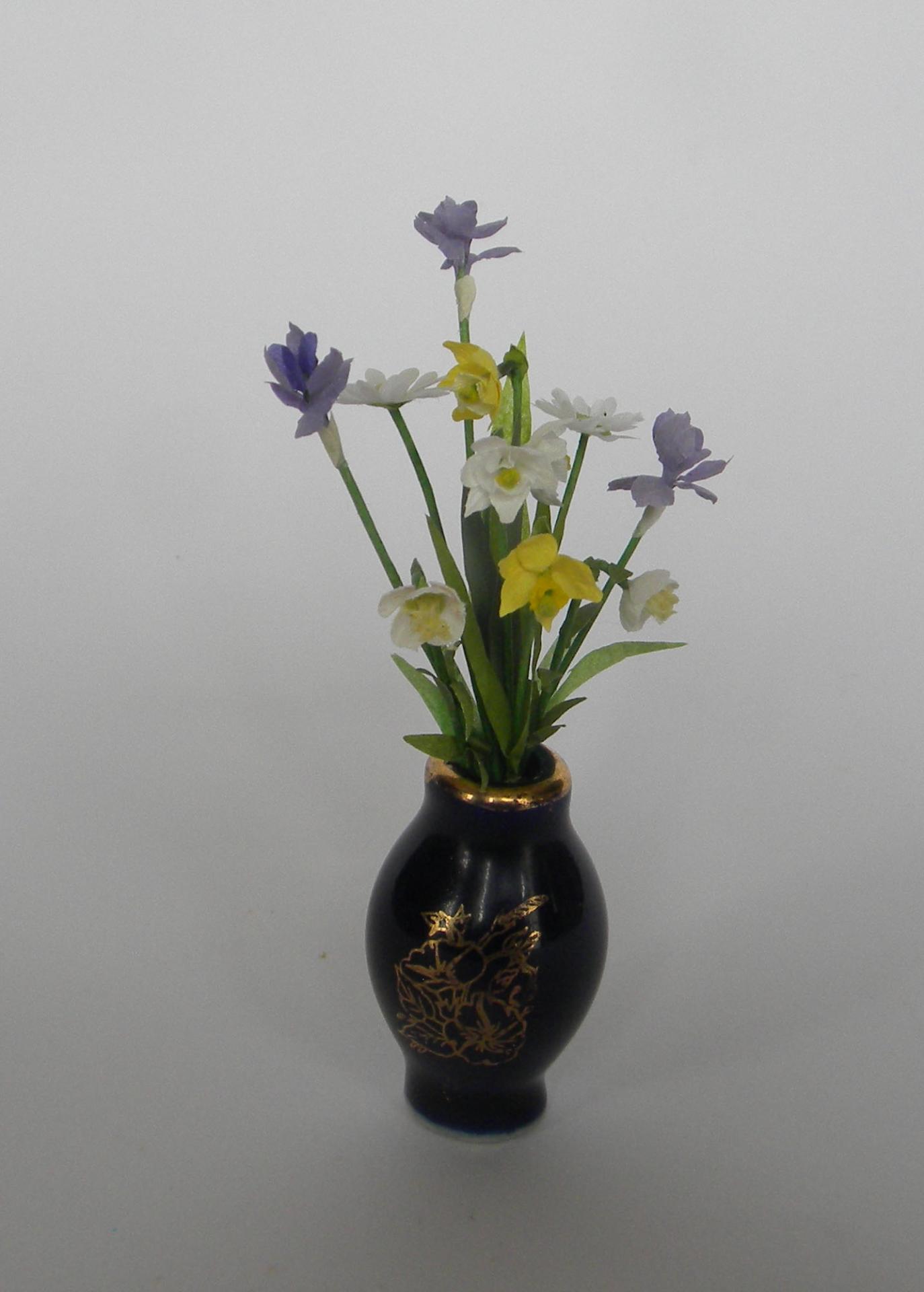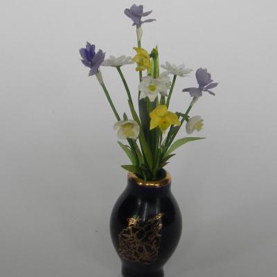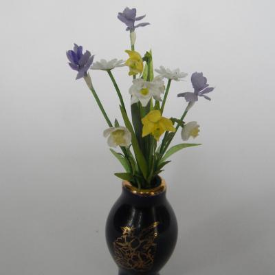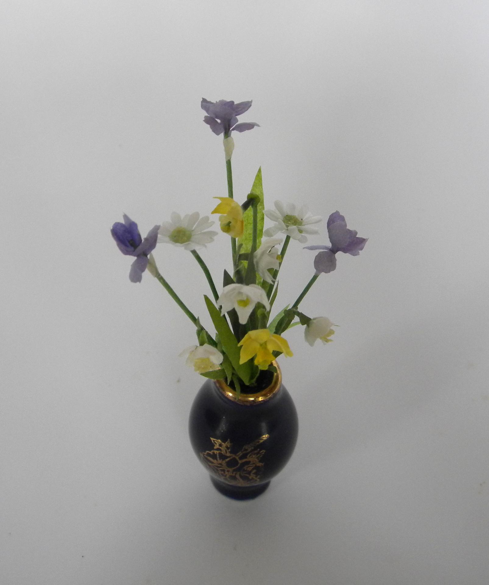 Nouquet de fleurs miniatures composé d'iris et de jonquilles et narcisses présenté dans un vase en Limoges bleu de four orné d'un délicat motif doré