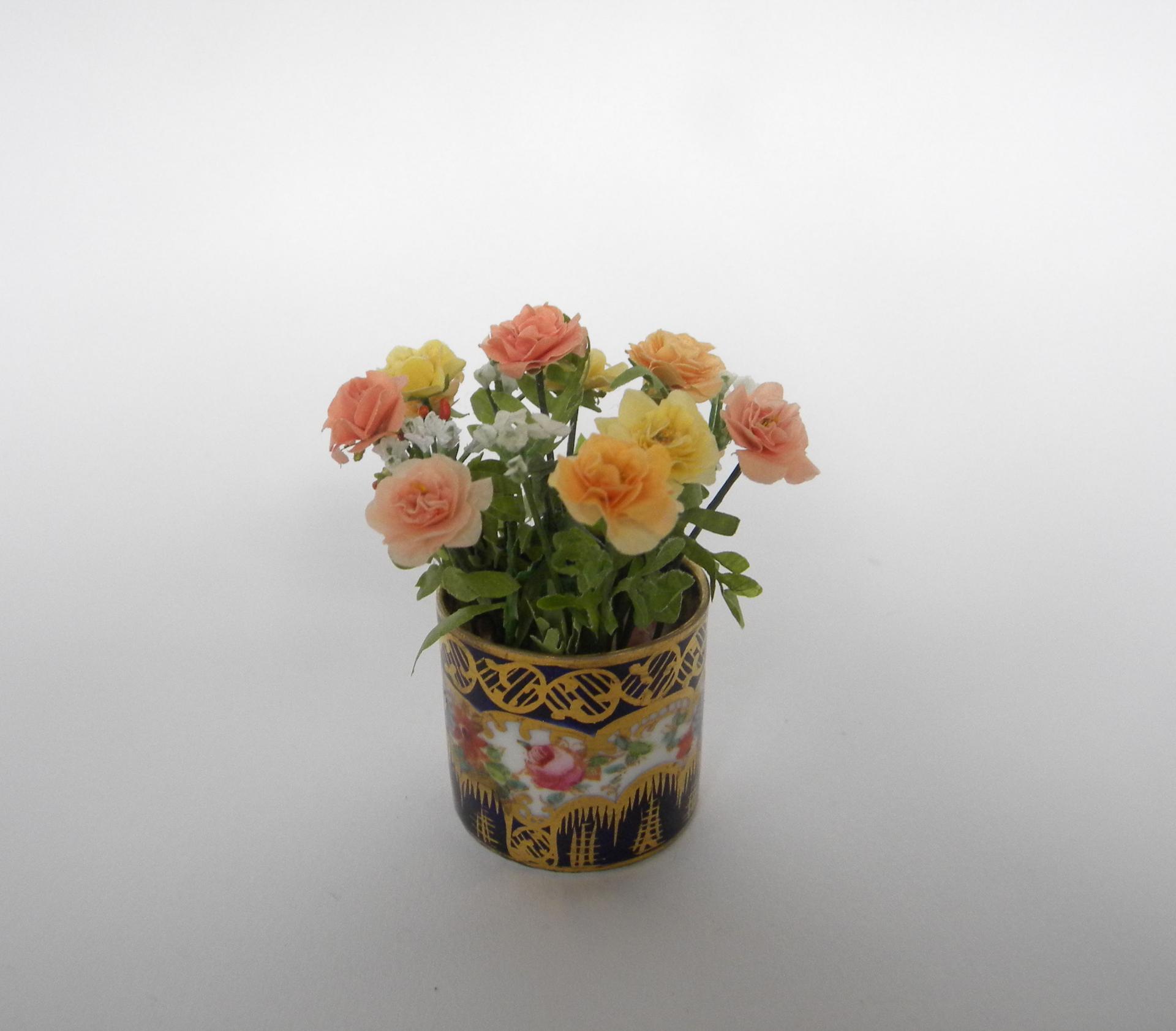 Bouquet miniature dans les tons orangés composé de roses et de gypsophile dans une rare tasse en porcelaine de Crown Staffordshire datant des environs de 1910 bleu de four et or avec motif floral