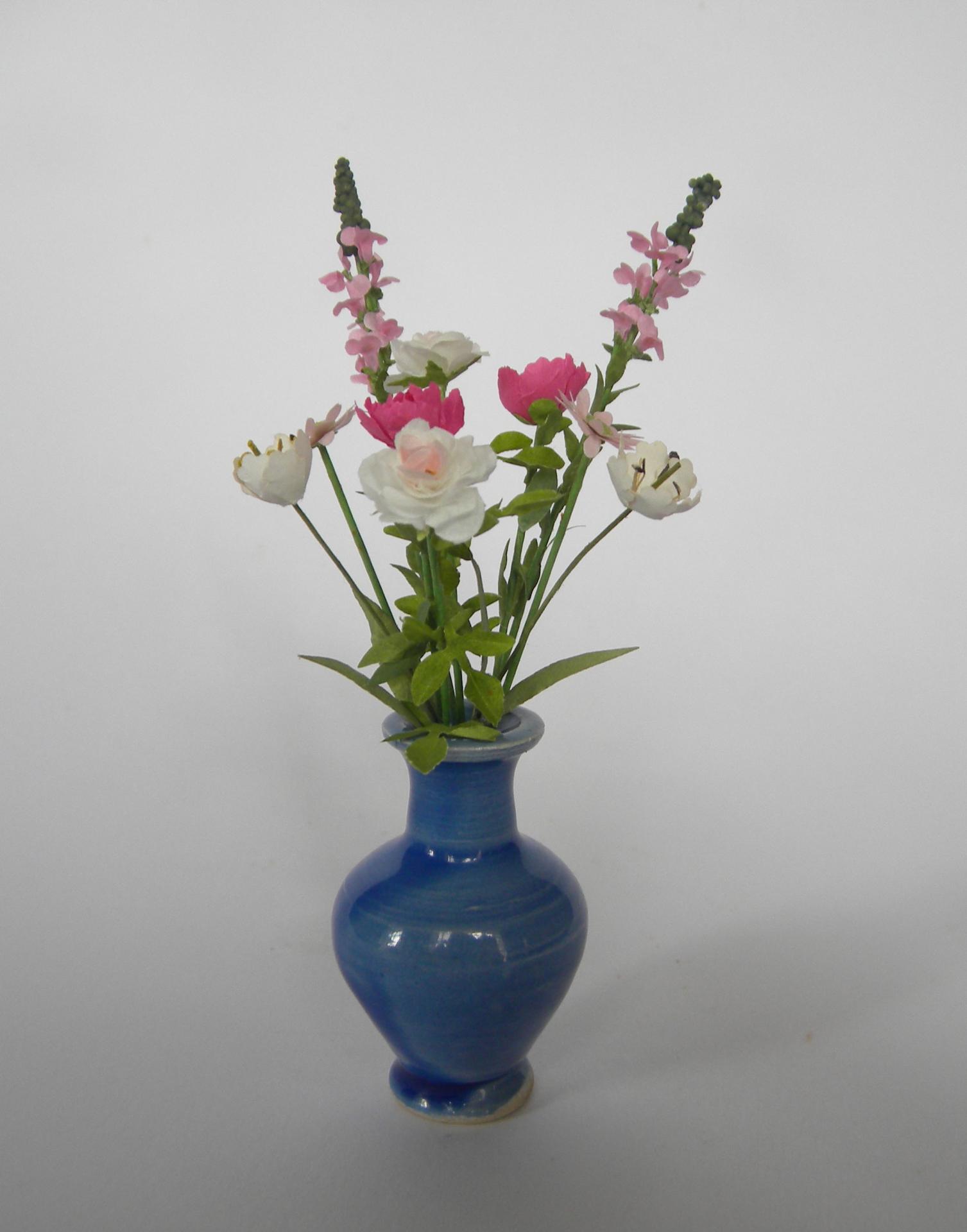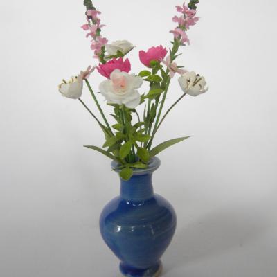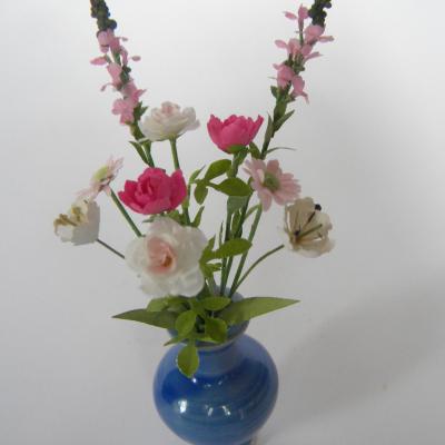 Très joli bouquet miniature de pivoines rose vif , de roses blanches , de gerbéras , de, tulipes et de mufliers , dans un vase en faience bleu clair