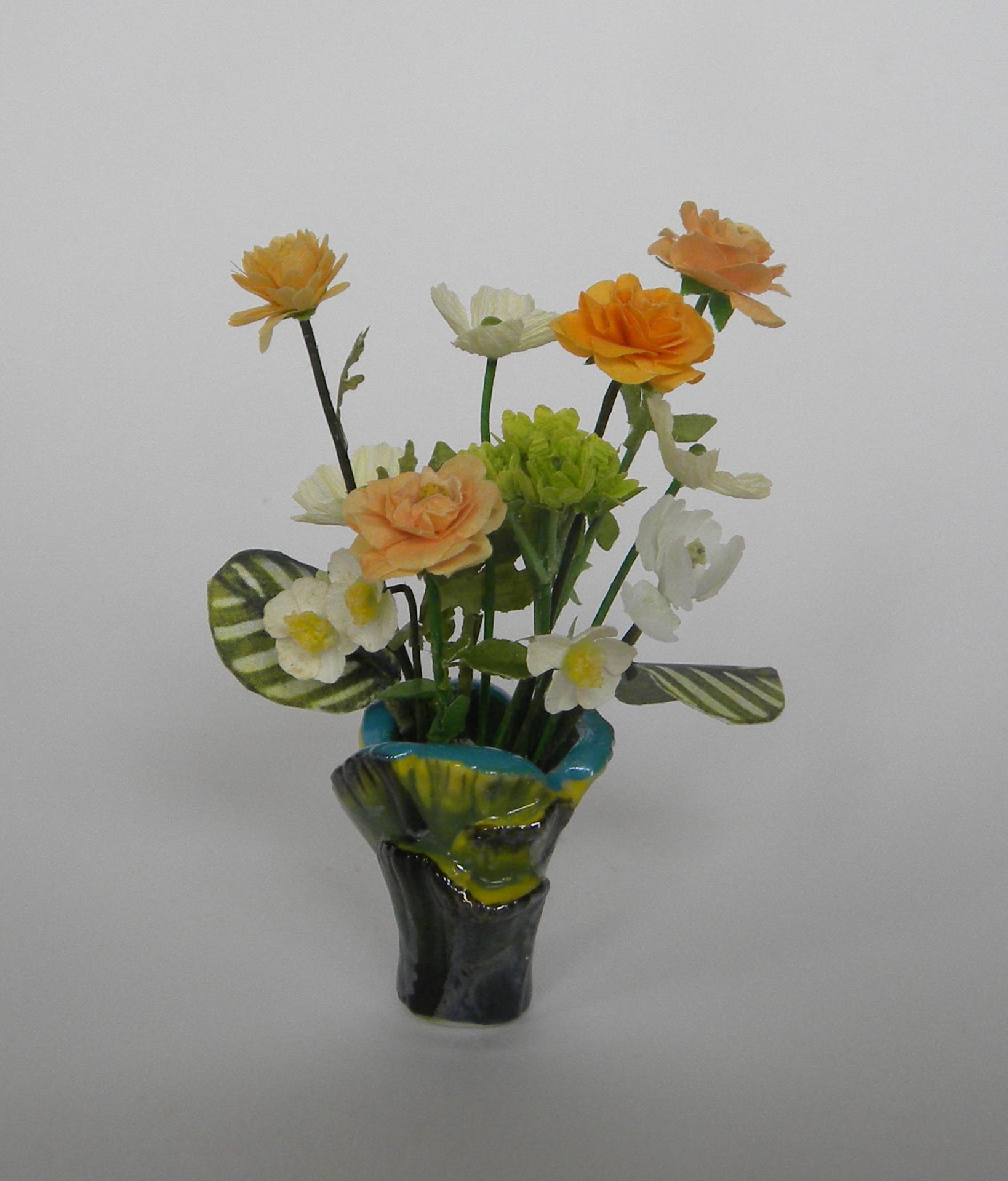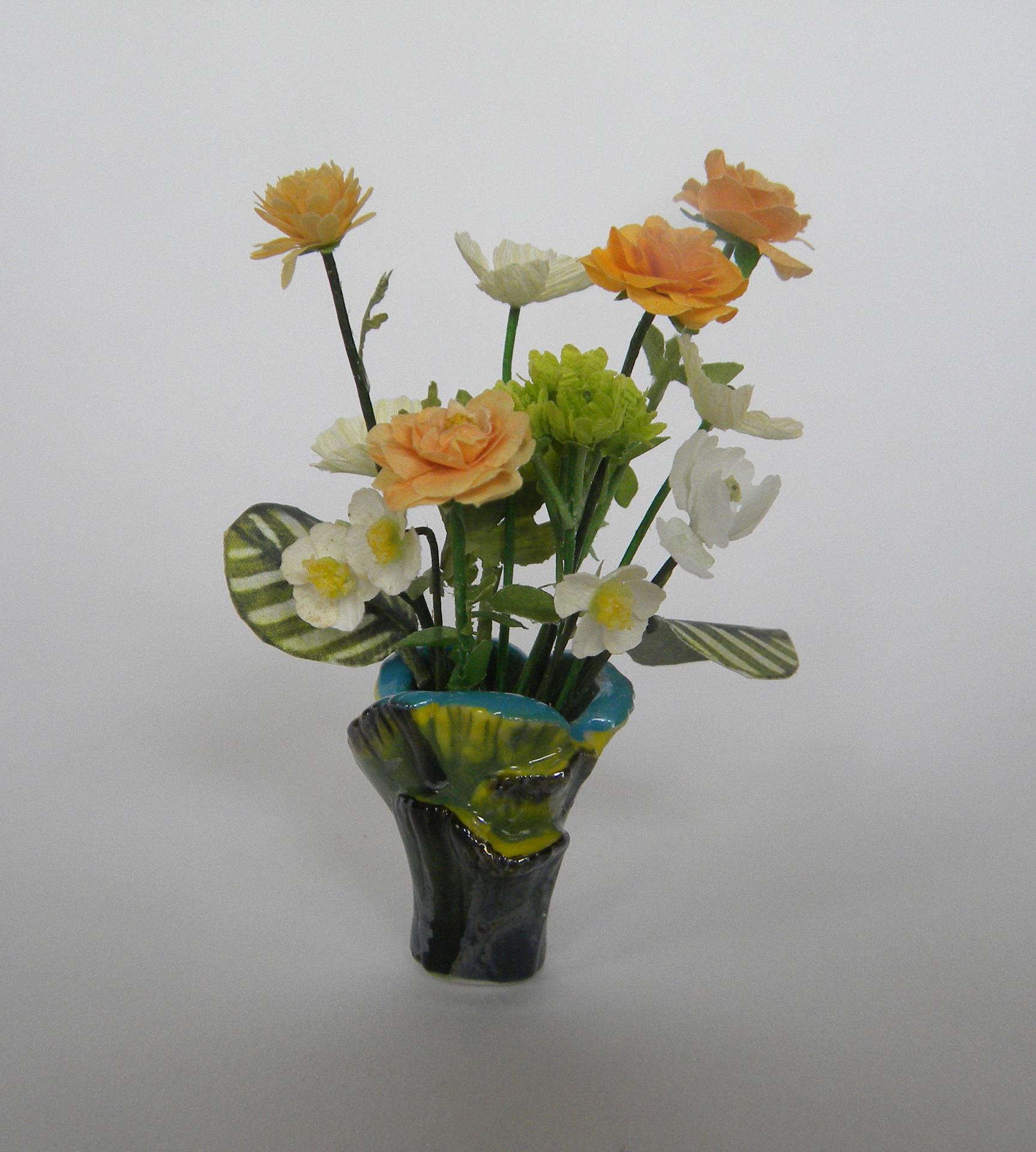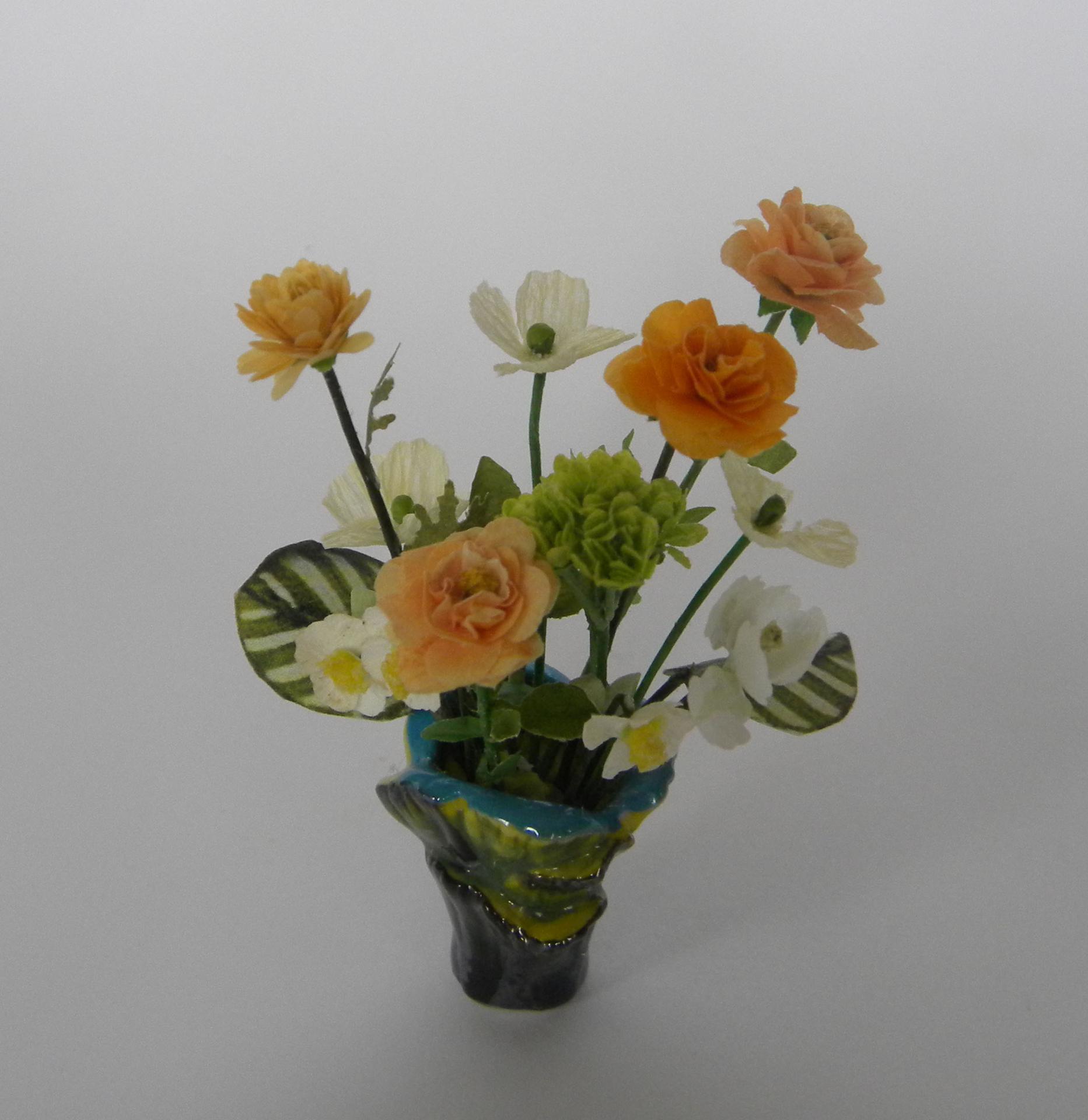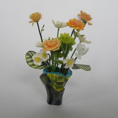 Bouquet miniature composé de roses , tulipe , pavots et feuillages dans les tons orangés , présenté dans une copie une copie de vase Daum de style Art Déco de diverses nuances de vert