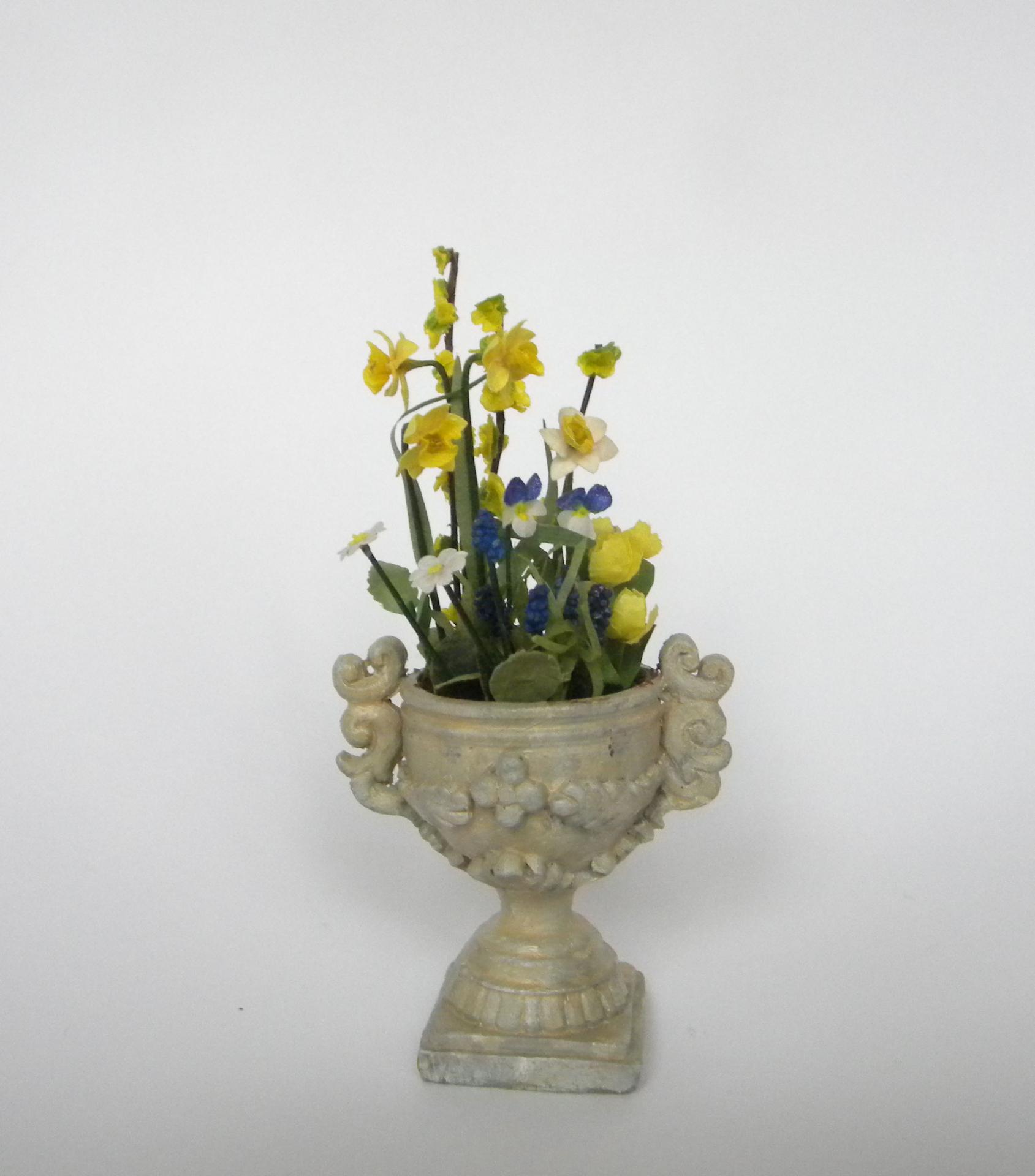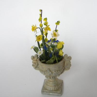 Composition miniature composé de forsythia , jonquilles, tulipes , primevères, pensées et muscaris dans une coupe de style Médicis beige imitation pierre