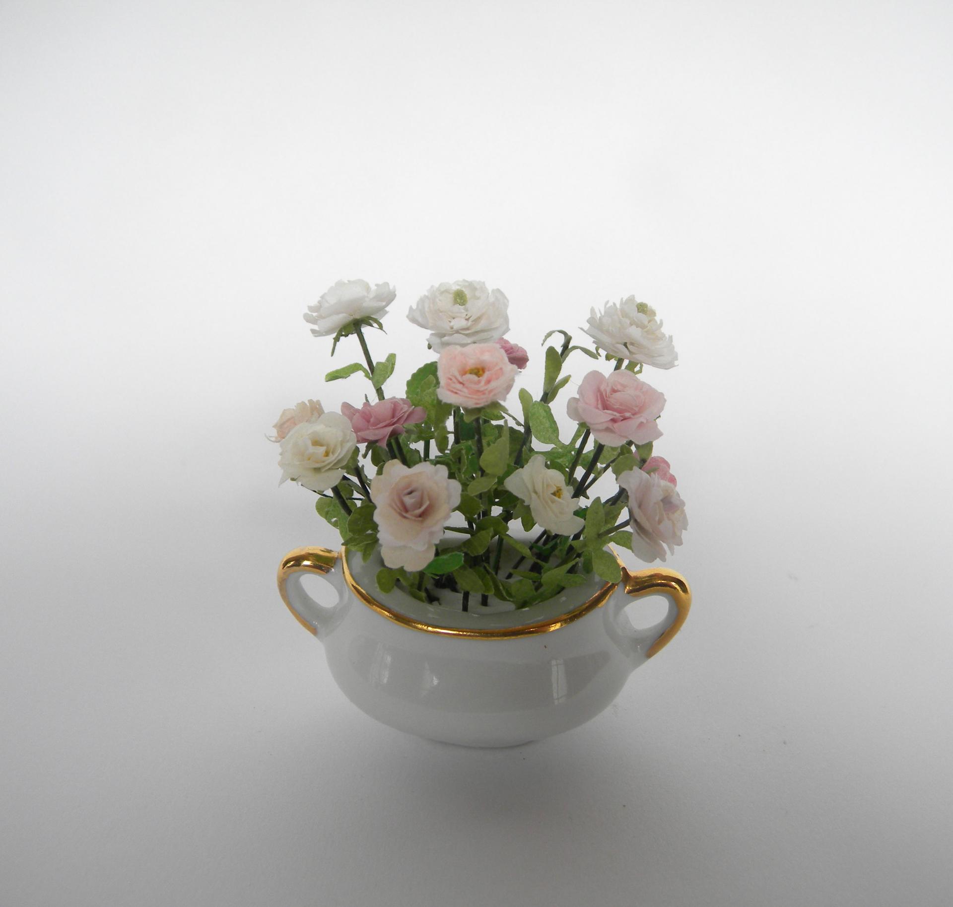 Coupe miniature en porcelaine de Limoges blanche avec liseré or datant du tout début du XX° siècle garnie de roses blanches et de divers tons de rose