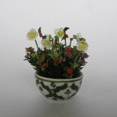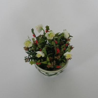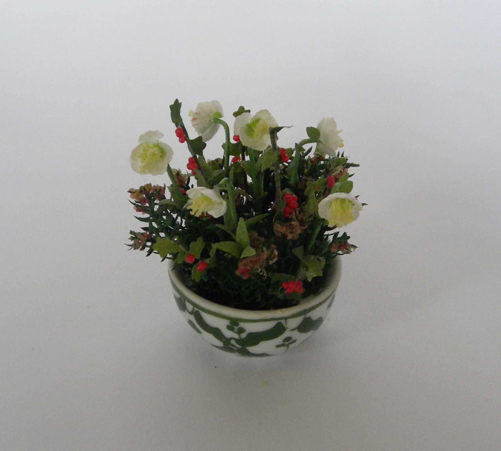Coupe de Noel miniature composée de roses de Noel , houx et bruyère dans une coupe blanche à motifs vert