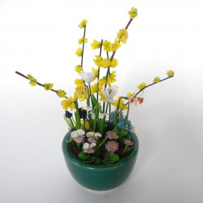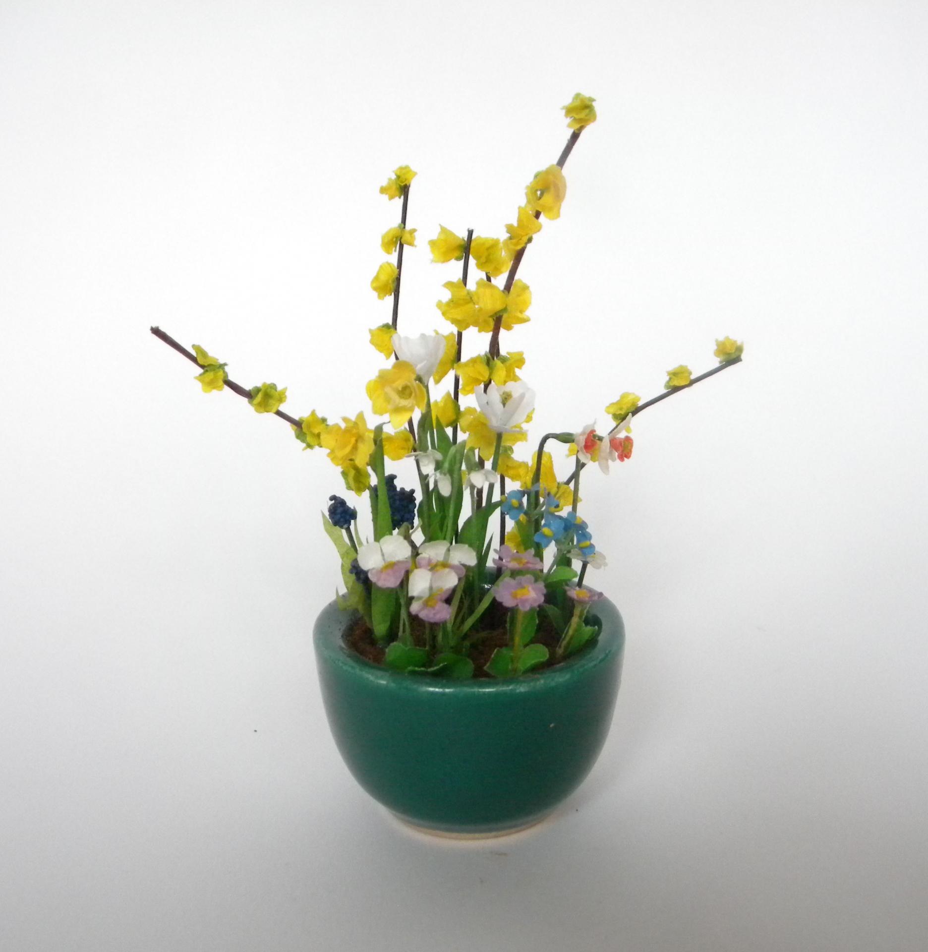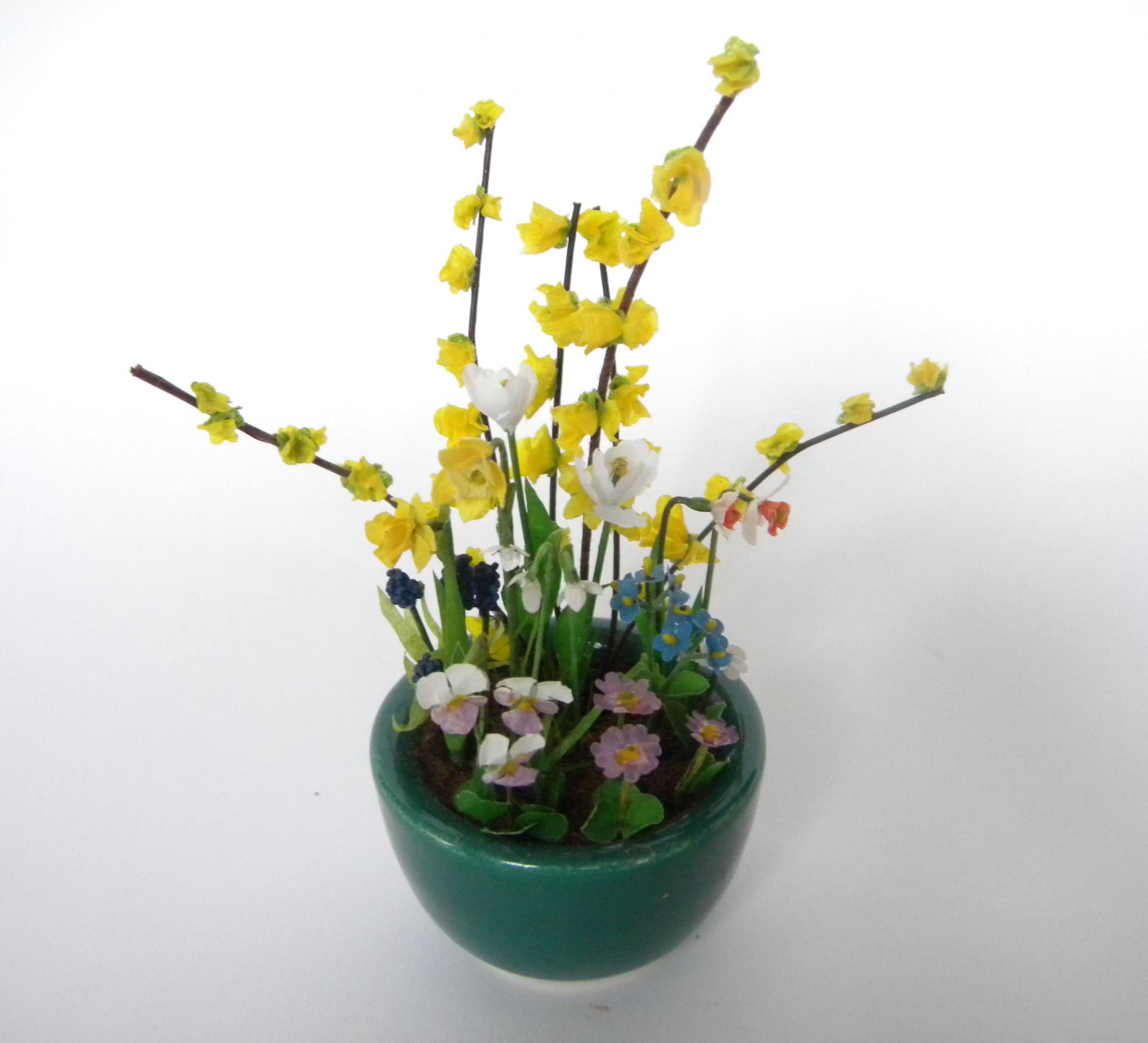 Grande composition miniature de fleurs de printemps : forsythia, narcisses , jonquilles , tulipes, muscaris, primevères , pensées , myosotis et muscaris dans une coupe en porcelaine datant des années 50
