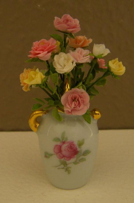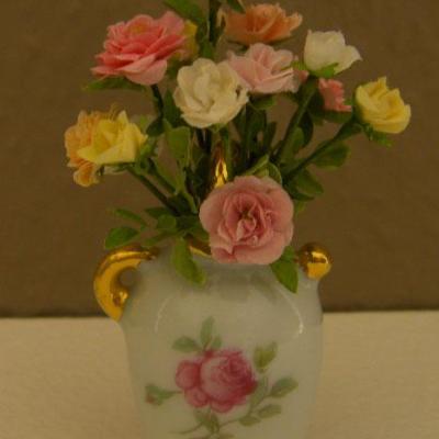 Bouqunet miniature de roses aux tons pastel dans une cruche en porcelaine de Limoges datant du début du XX° siècle