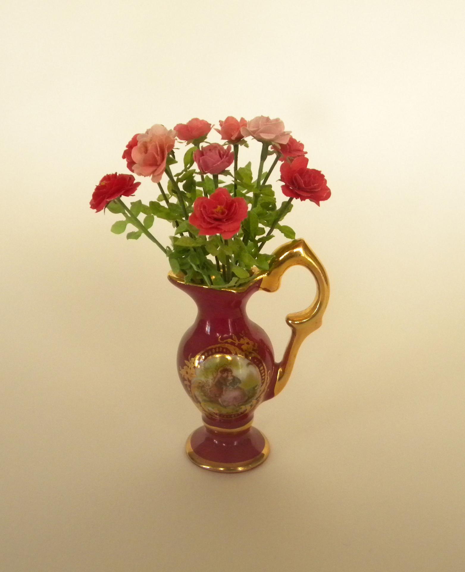 Bouquet de roses rouges et roses contenu dans une très belle cruche en Limoges avec scène galante sur fonds rouge