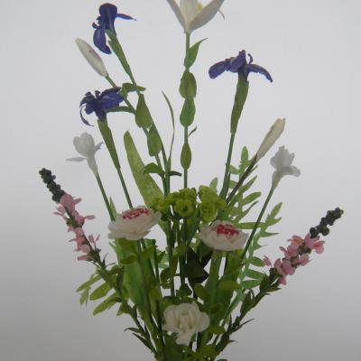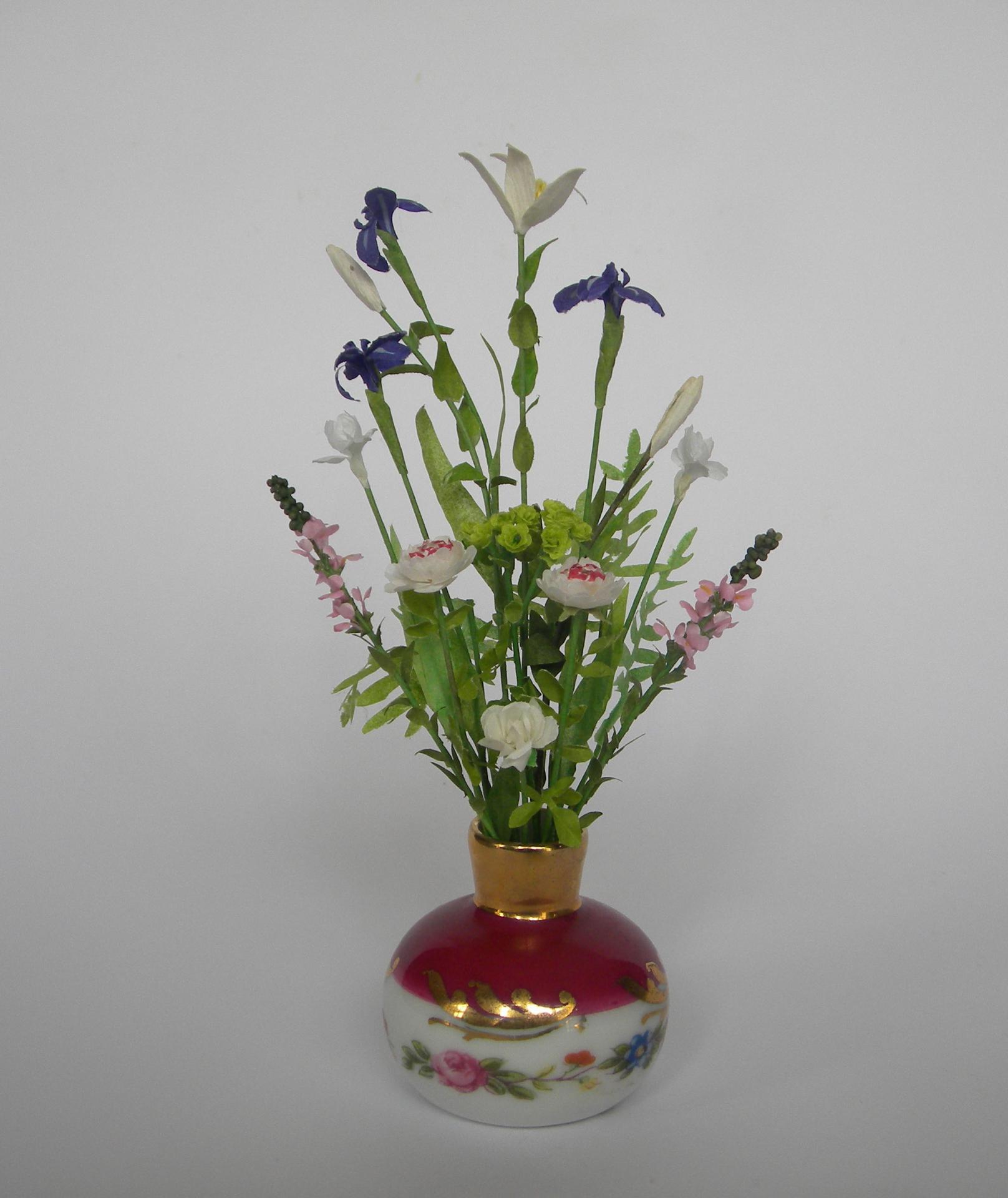 Gransd bouquet de fleurs miniatures composé d'iris , de roses , de chrysanthèmes , de lys et de mufliers présenté dans un exceptionnel vase en Limoges ancien à fond rouge rehaussé d'or avec de délicats motifs floraux