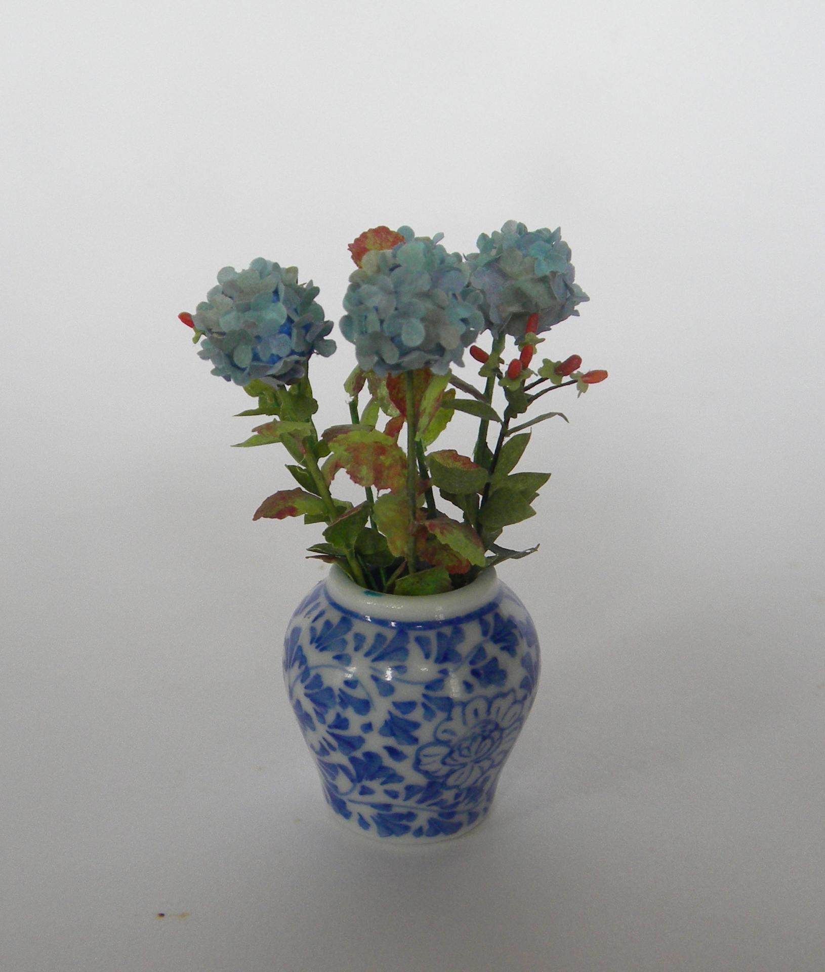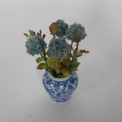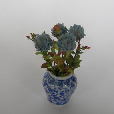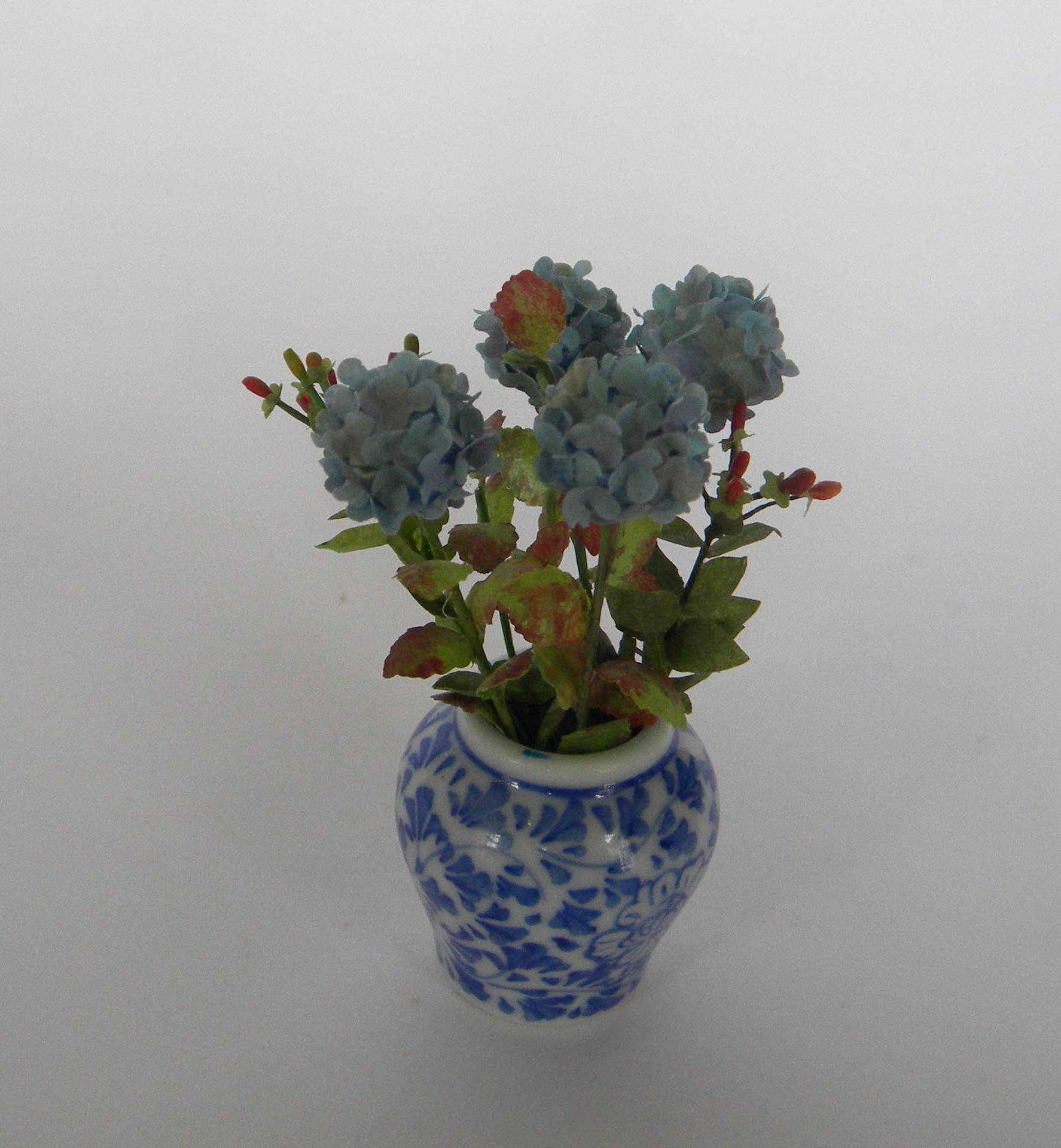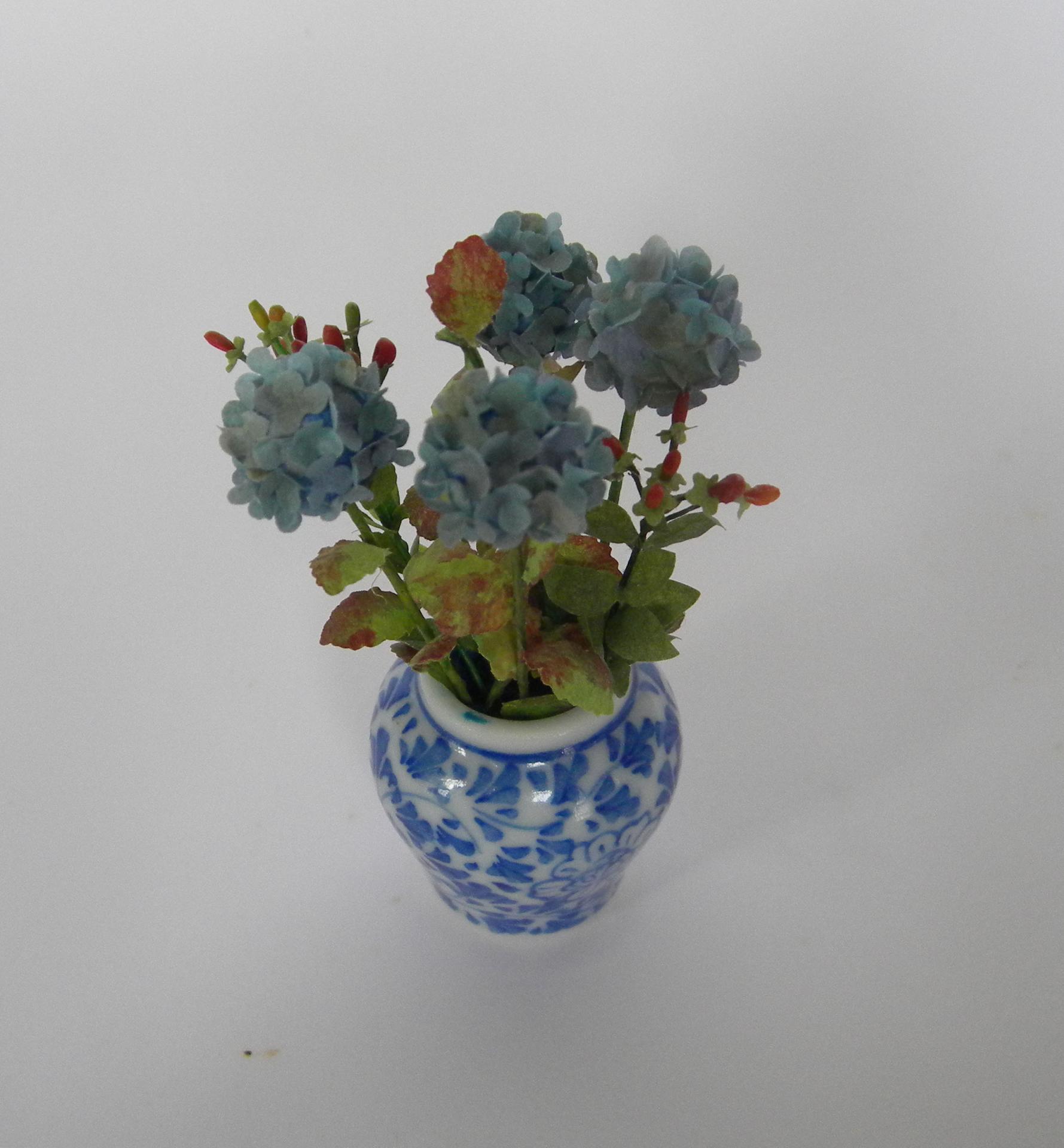 Composition miniature avec hortensia bleu fané et millepertuis dans une potiche de style chinois aux motifs bleus sur fonds blanc