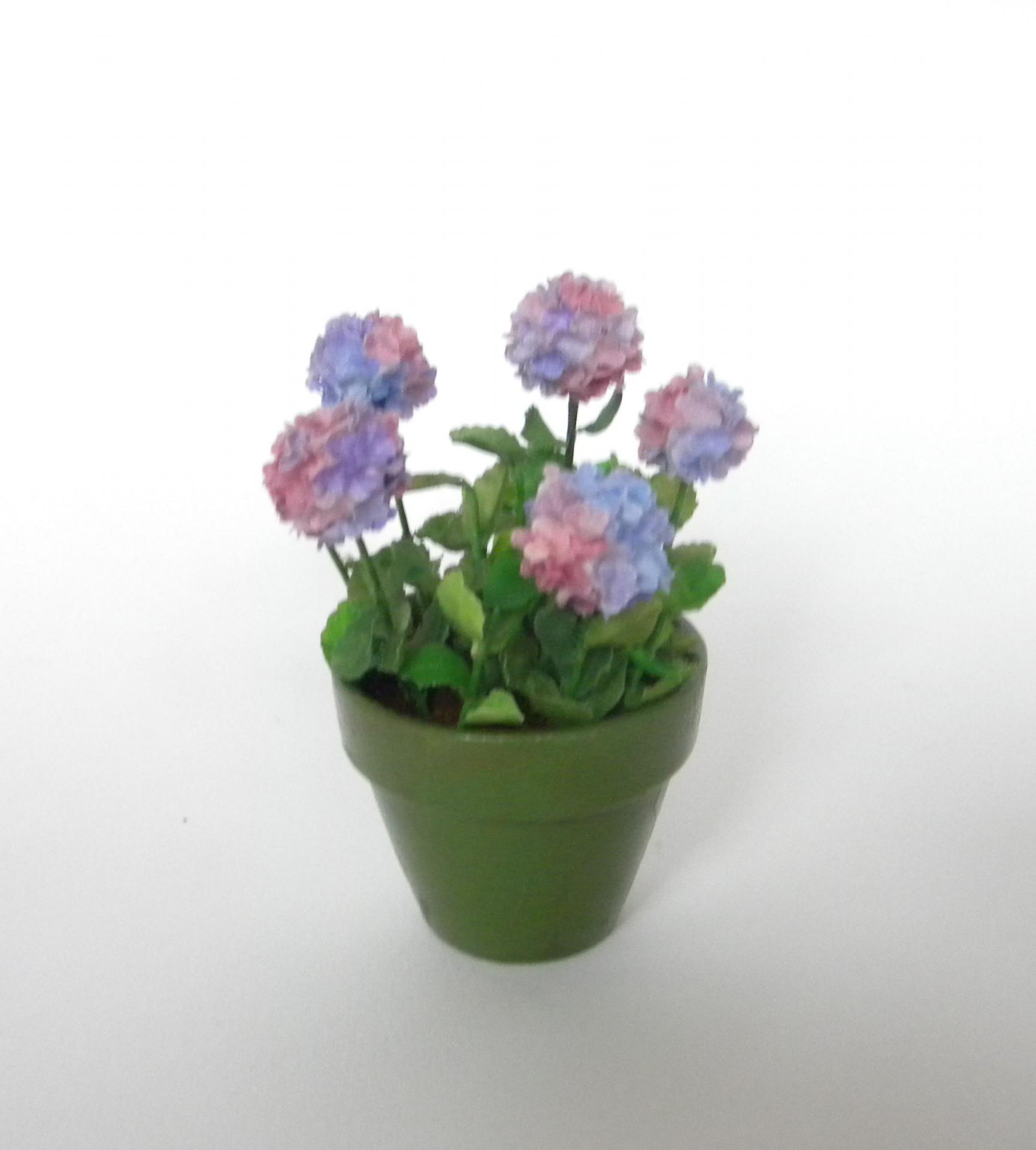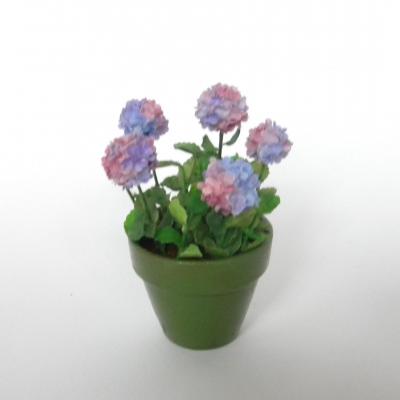 Hortensia miniature aux couleurs changeantes entre le bleu et le rose dans un pot en terre cuite de couleur verte