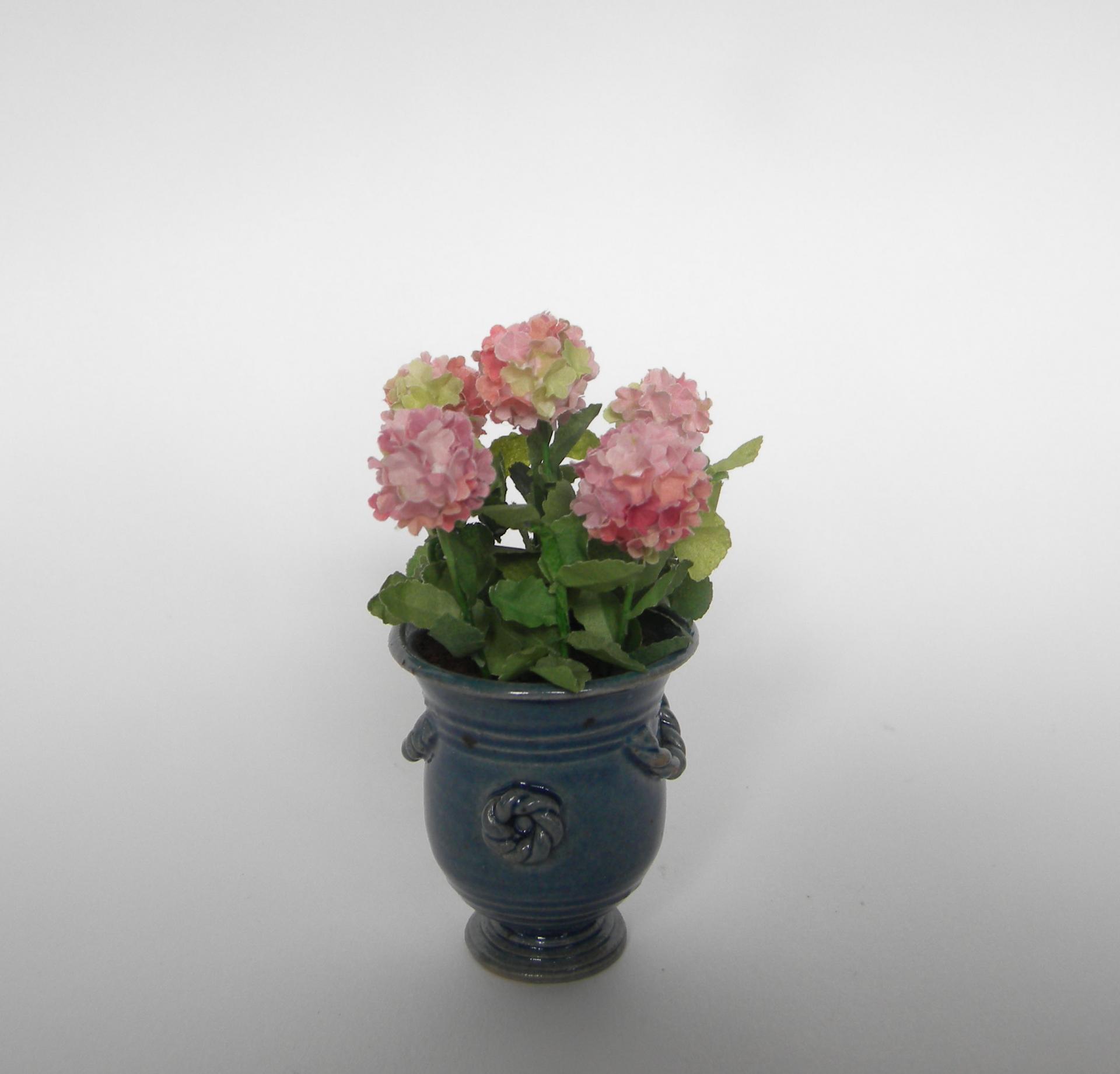 Hortensia miniature rose nuancé de vert dans un pot d'Anduze bleu créé par la miniaturiste Elisabeth Causeret