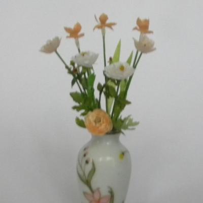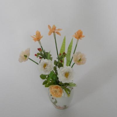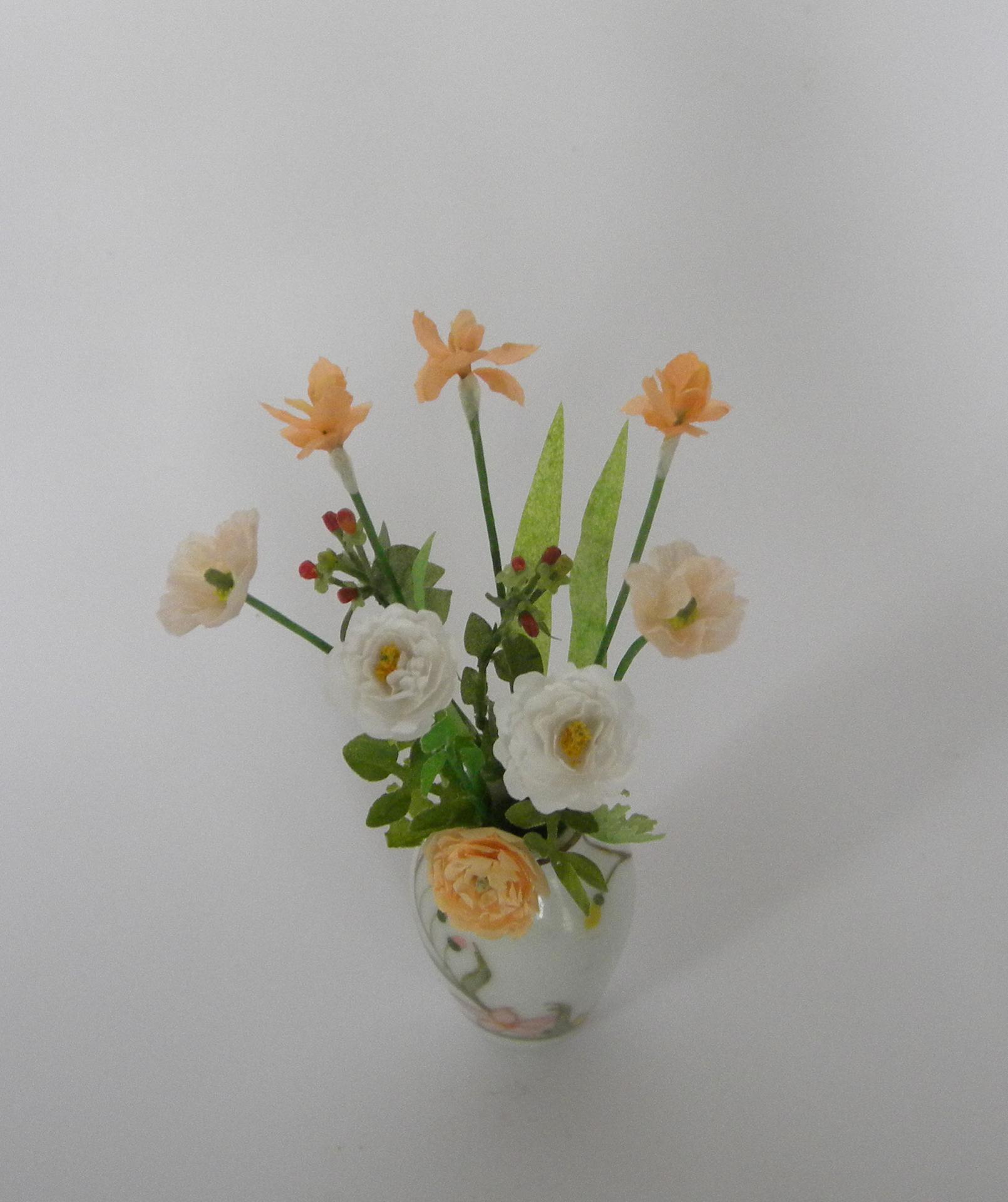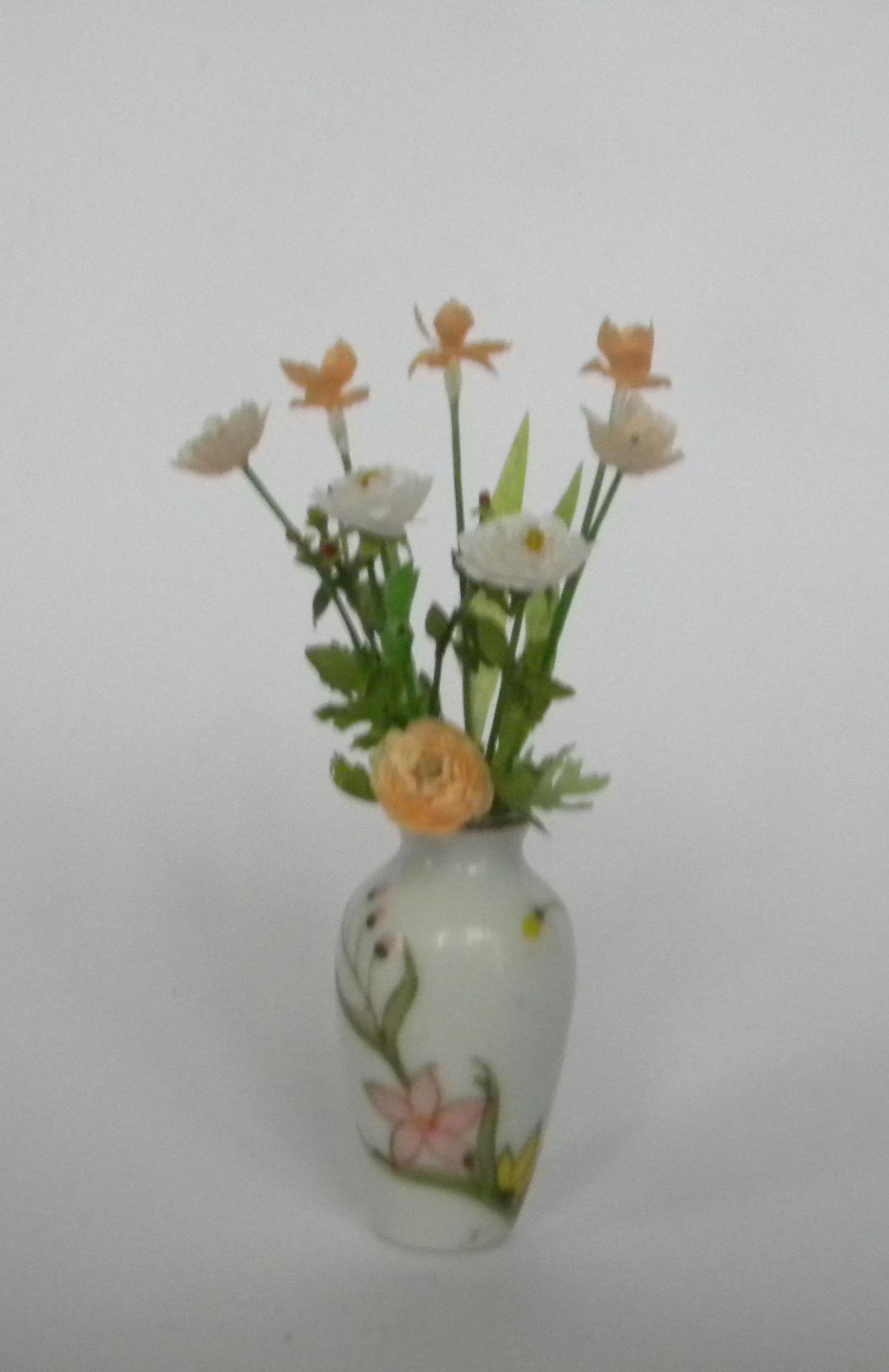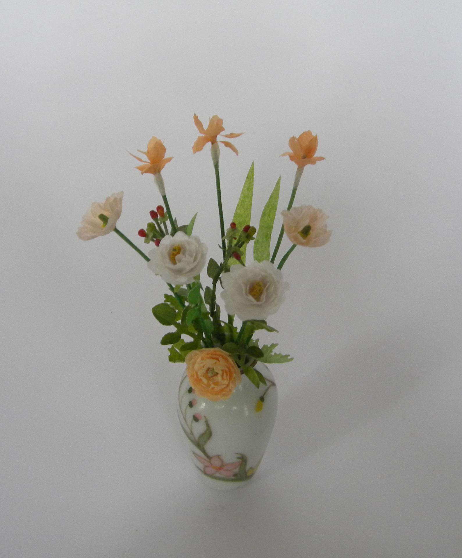 Bouquet de fleurs miniatures dans les tons saumon composé d'iris de pavots , de roses et de millepertuis dans un vase à décor floral