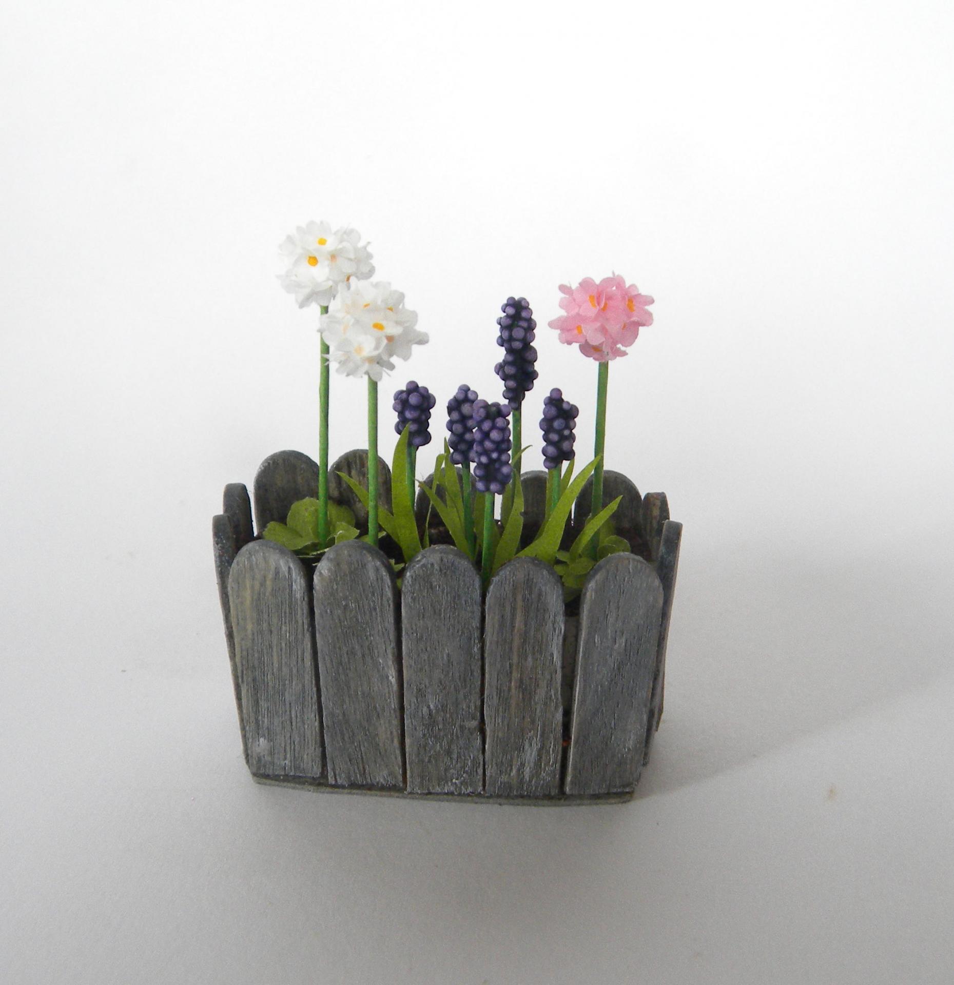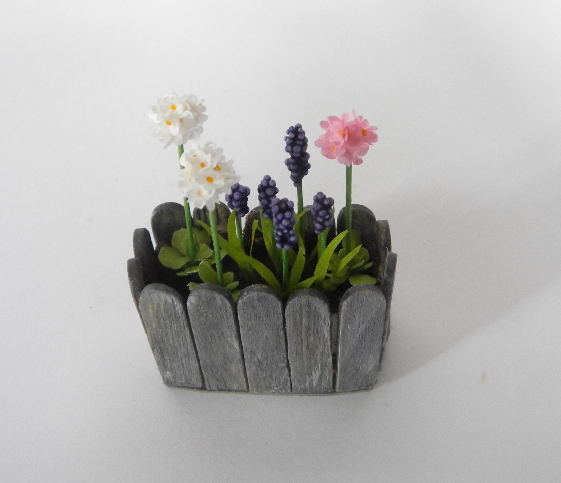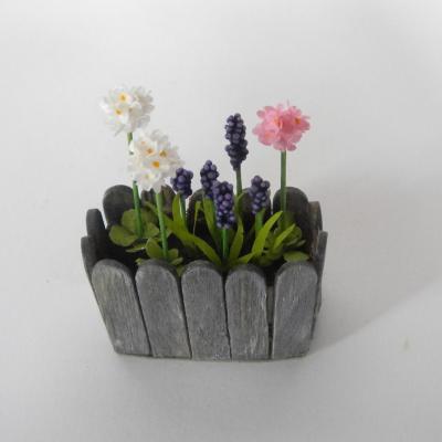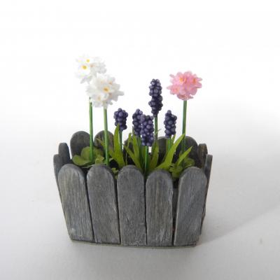 Jardinière miniature Shabby en bois patiné contenant des primevères candélabres blanches et roses et des muscaris