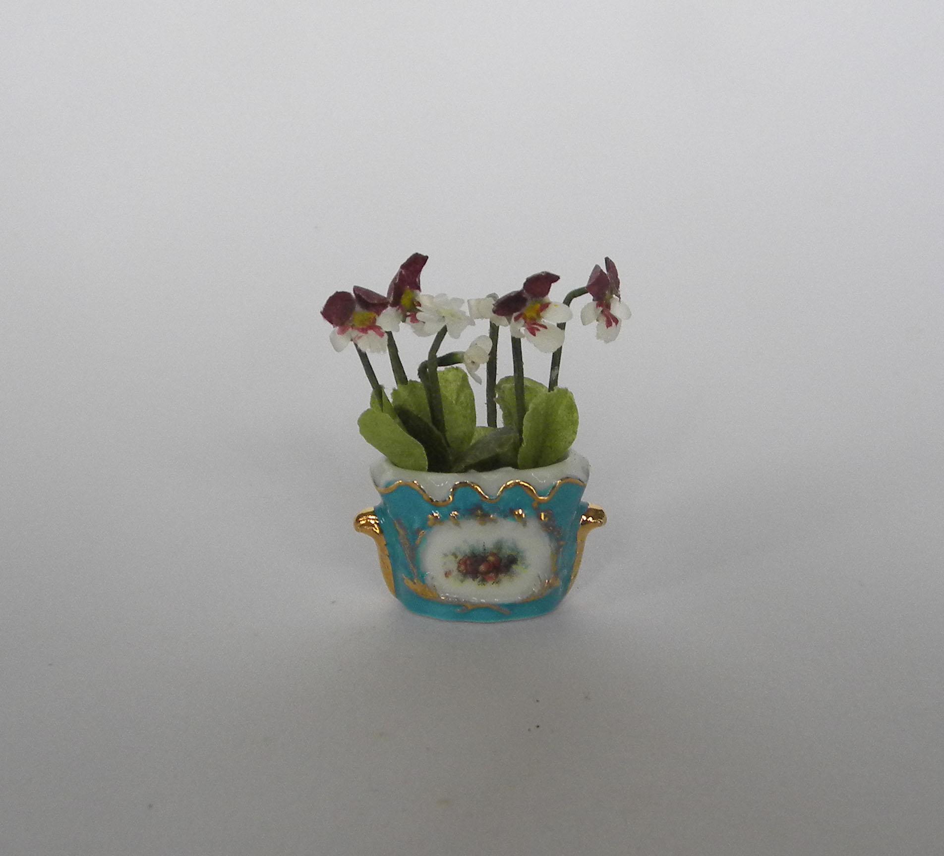 Petite jardinière miniature bleu et or à motif floral contenant des pensées et une primevère