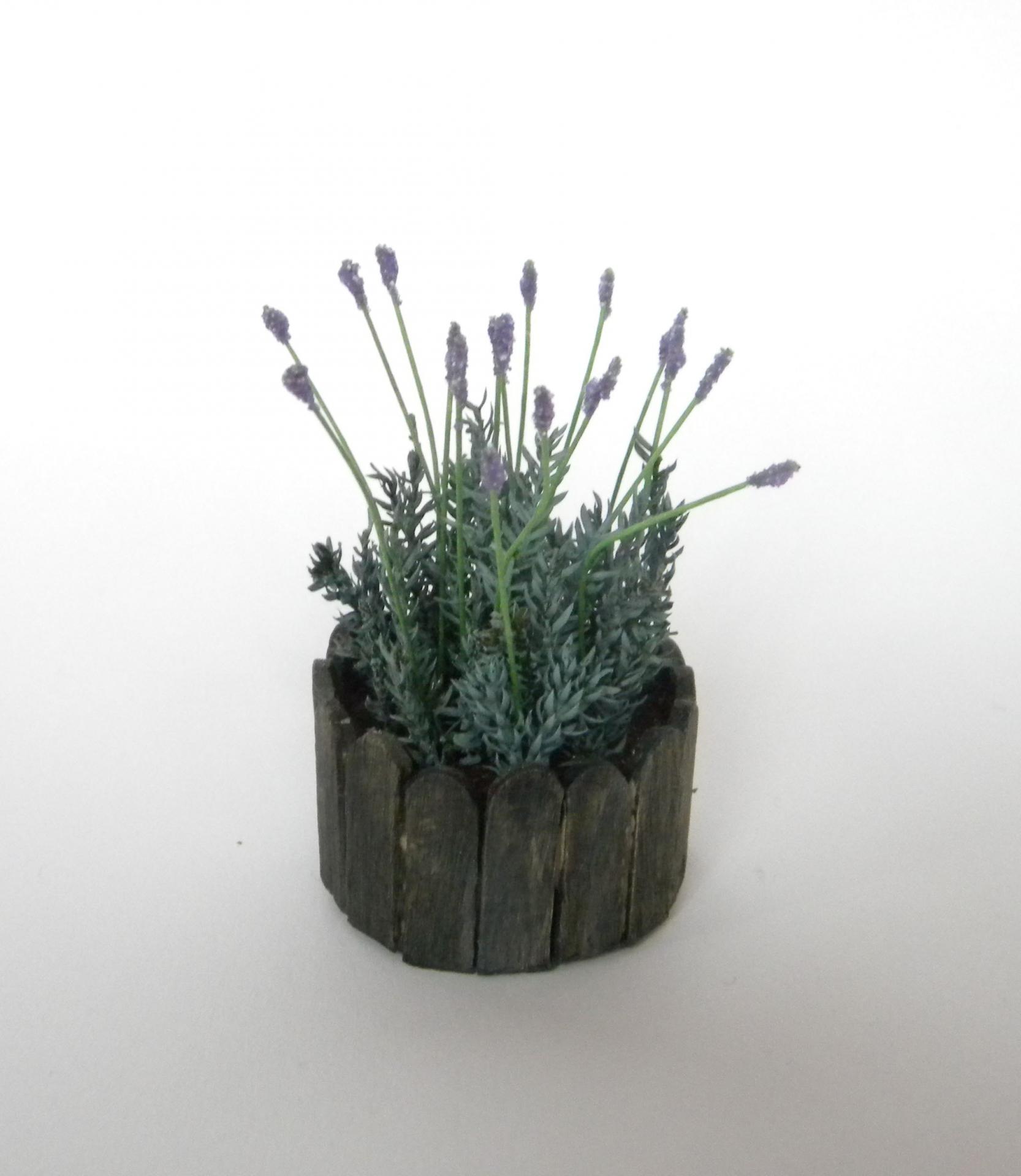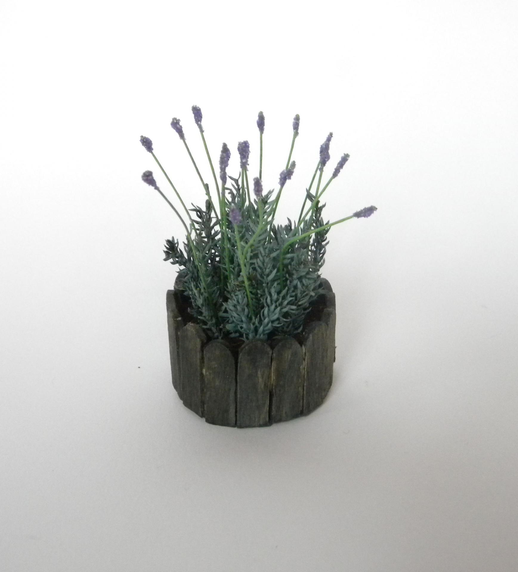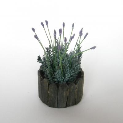 Jardinière ronde miniature de style Shabby chic en bois patiné contenant un pied de lavande