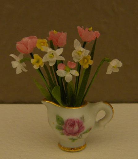 Petit bouquet miniature composé de tulipes et de narcisses dans un petit pot à lait en porcelaine de Limoges à décor fleuri datant du début du XX° siècle