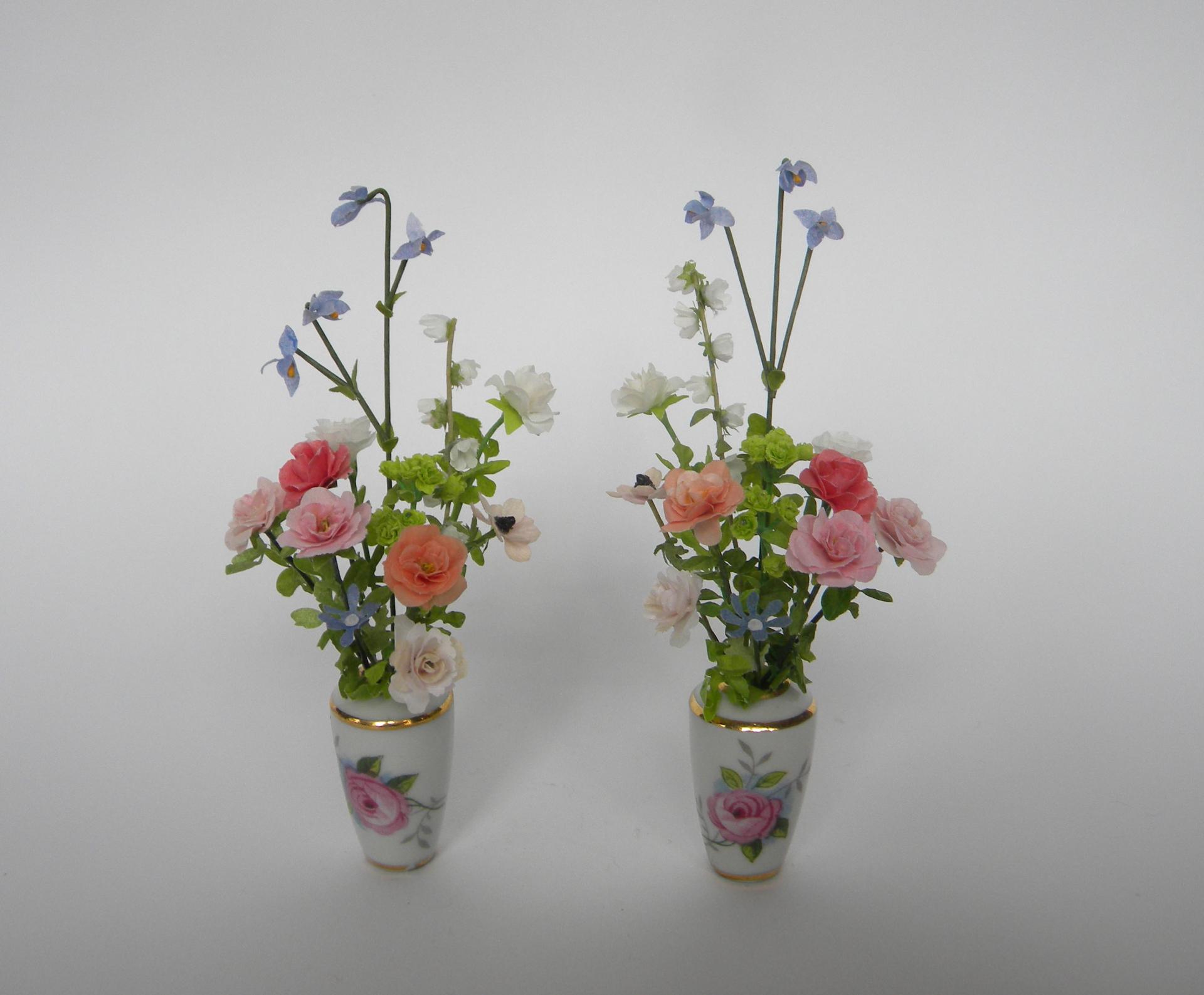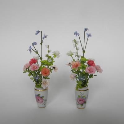Très belle et unique paire de vaes miniatures en Limoges au délicat motif de roses datant du tout début du XX° siècle contenant 2 bouquets réalisés en miroir avec ; des roses de fifférents tons pastel , chrysanthème , campanule , ancolie , scabieuses et anémone
