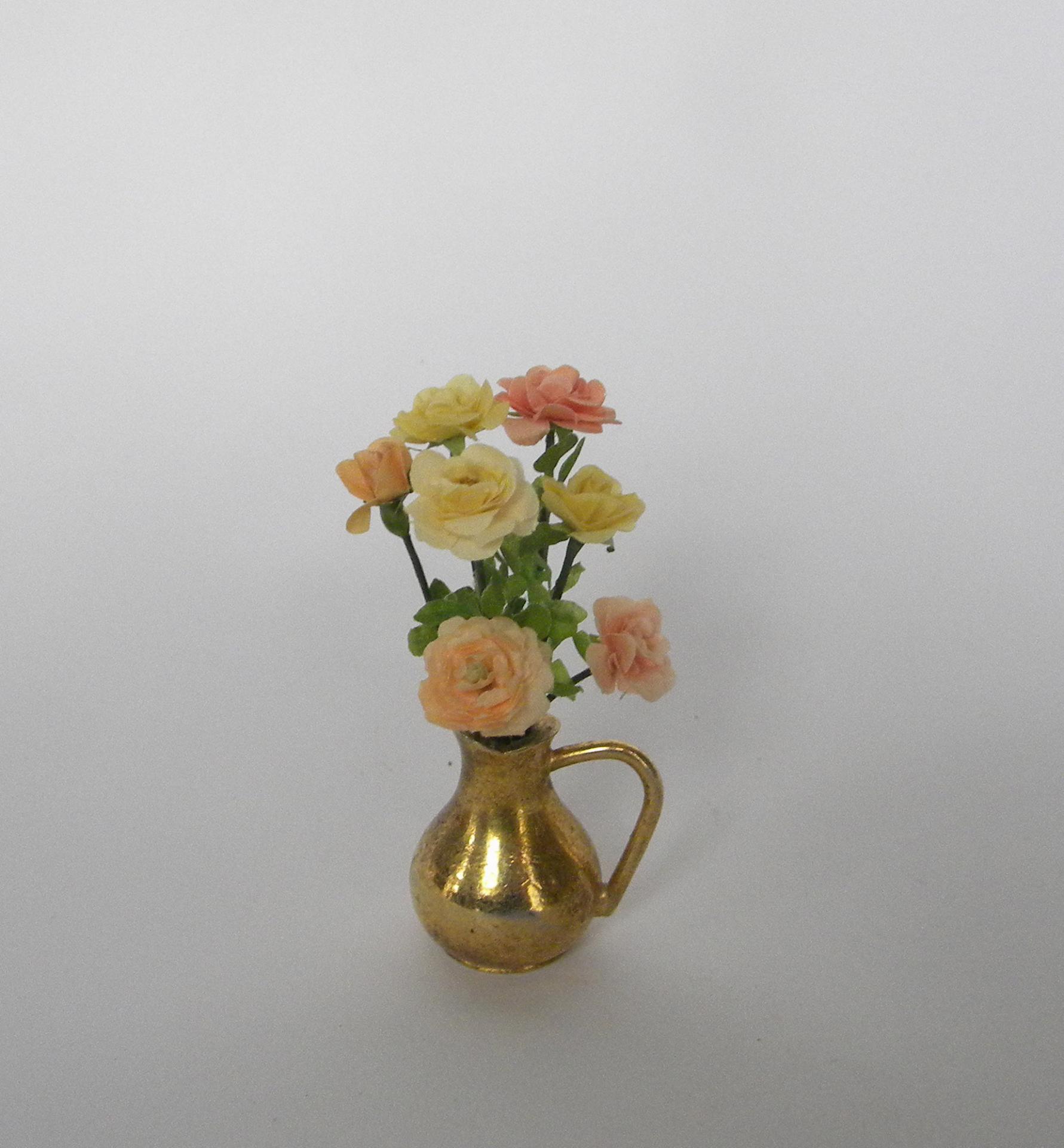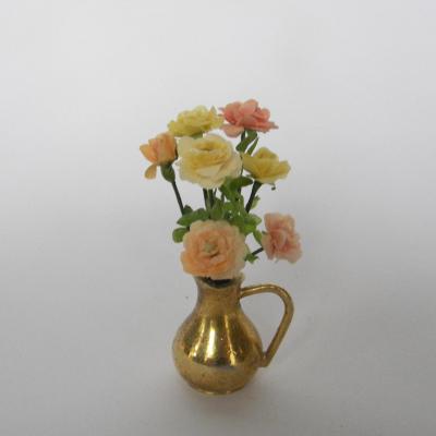 Bouquet de roses miniatures dans les tons jaune et orangé présenté dans un vse en laiton