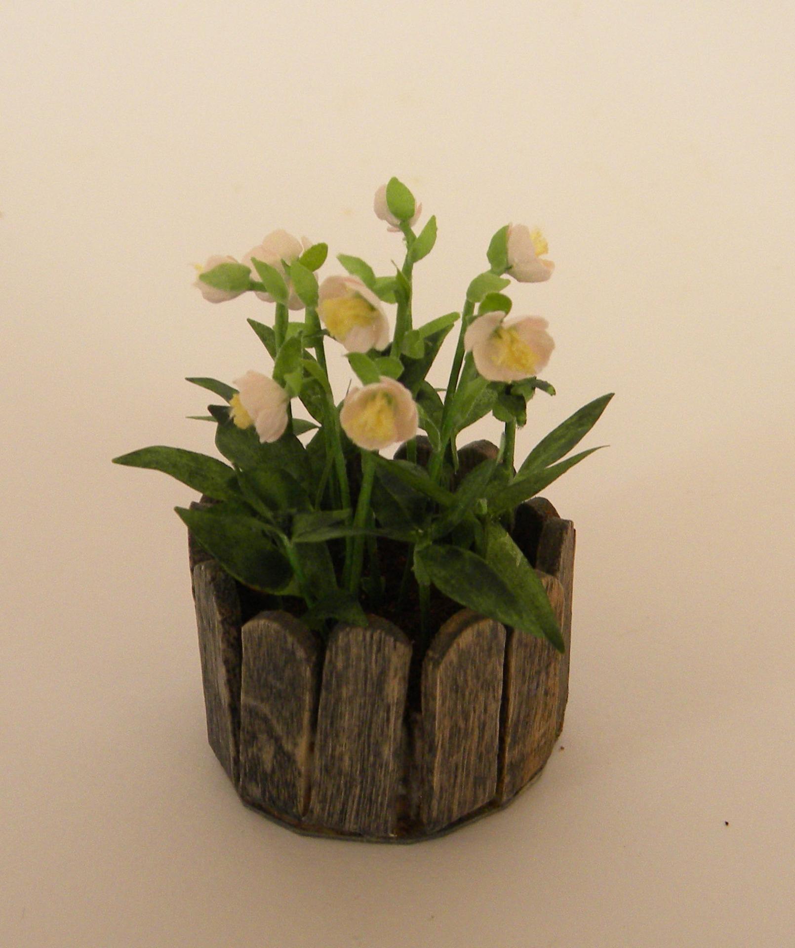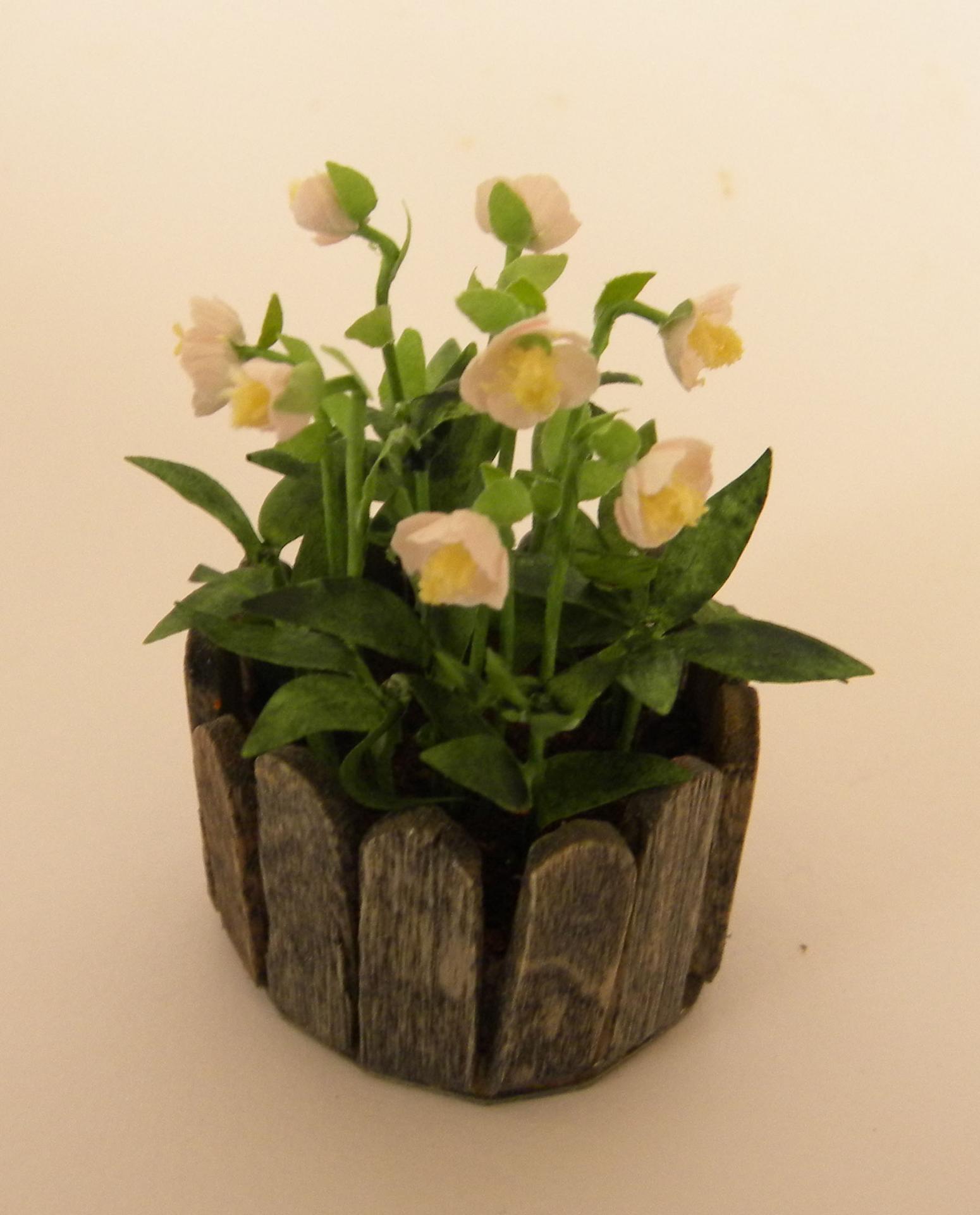 Une potée d'héllébores miniatures au 1/12° dans une jardinière en bois patiné