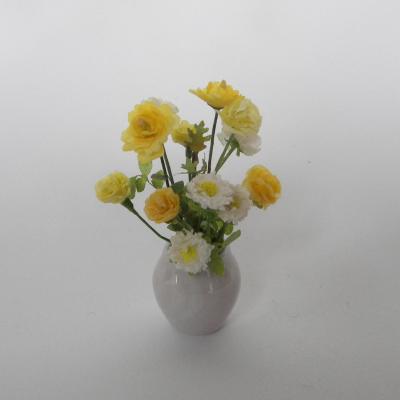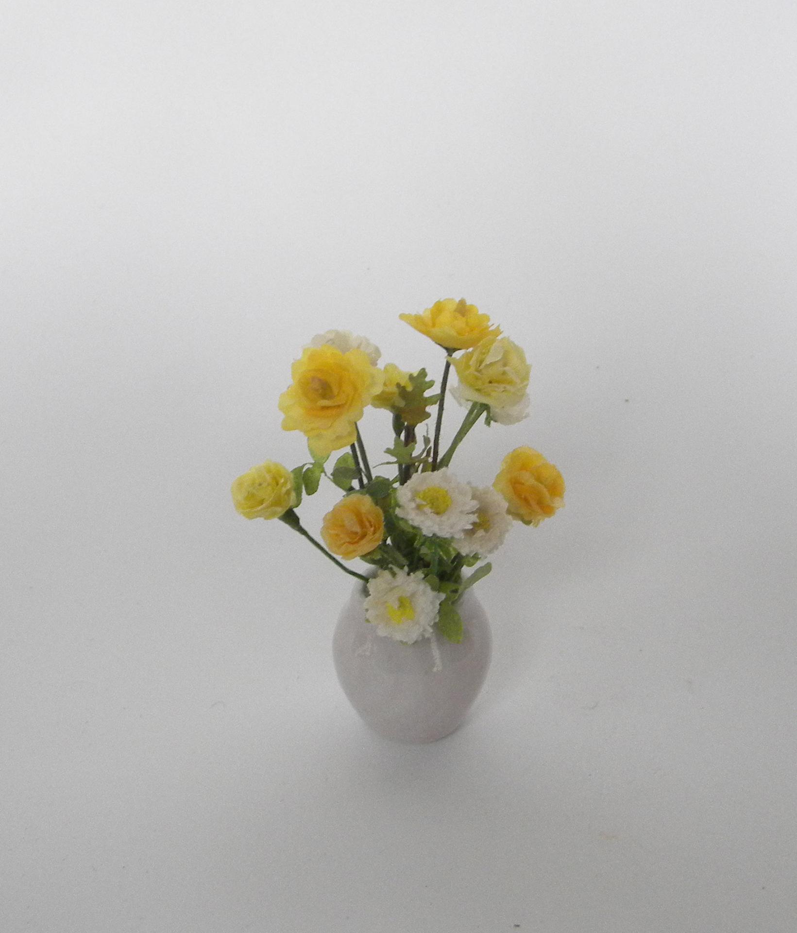 Composition miniature en jaune et blanc comprenant des roses des oeillets et des reines marguerites dans un vase moderne beige