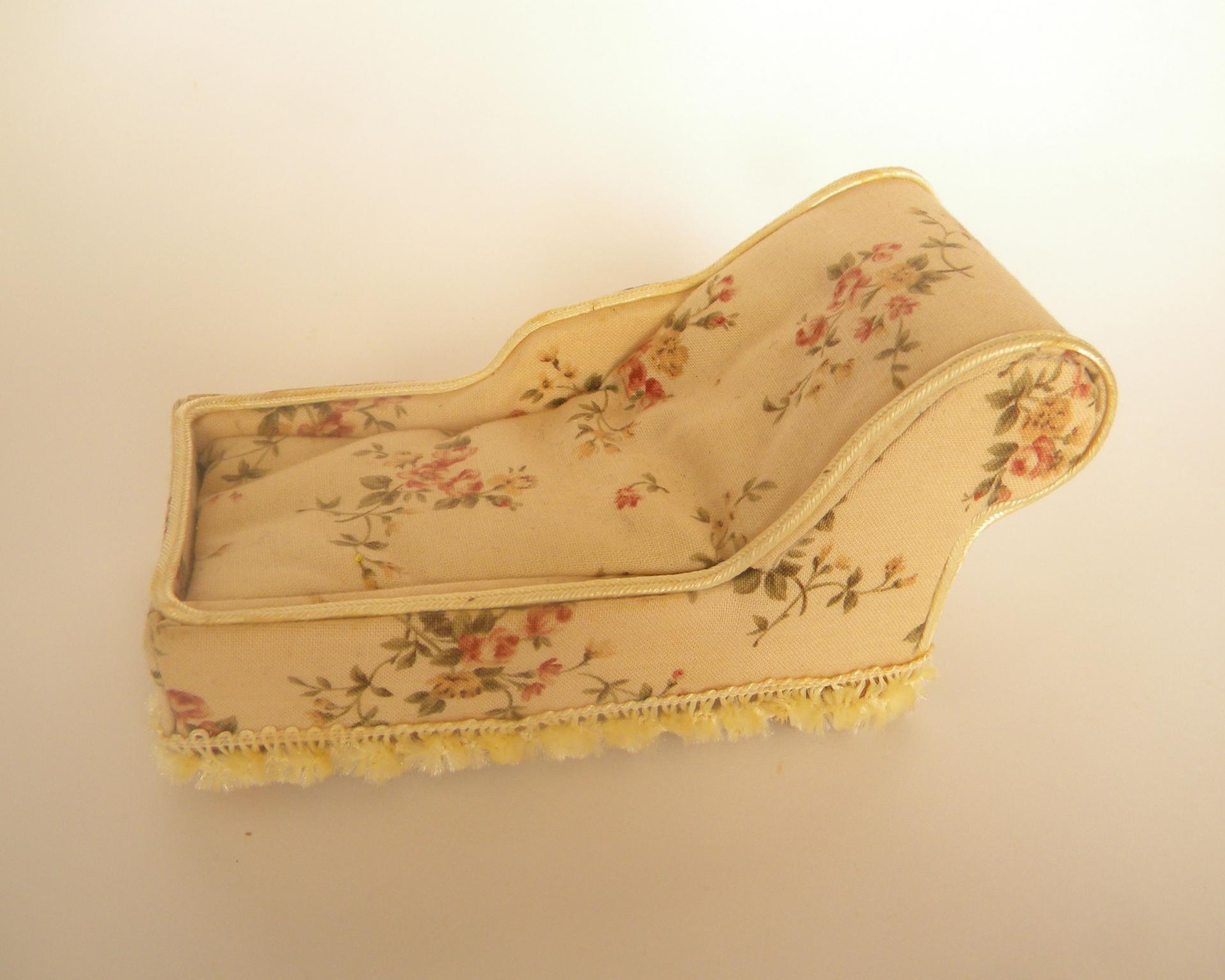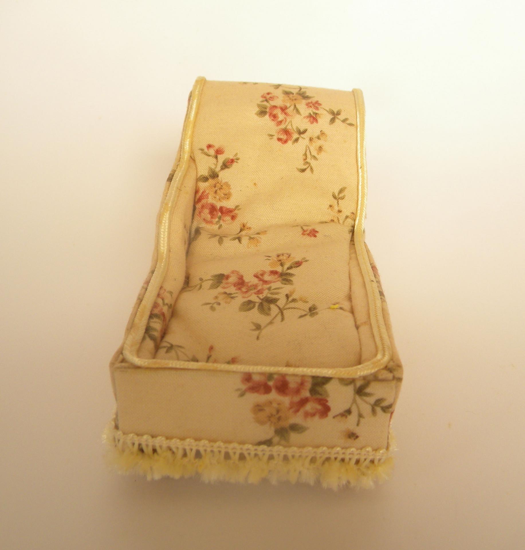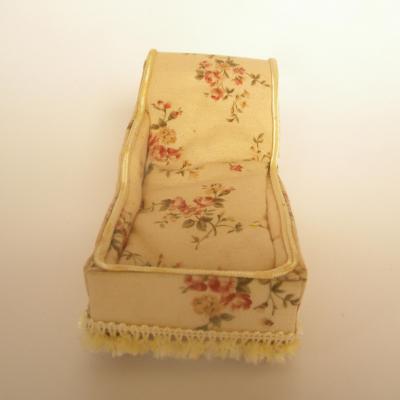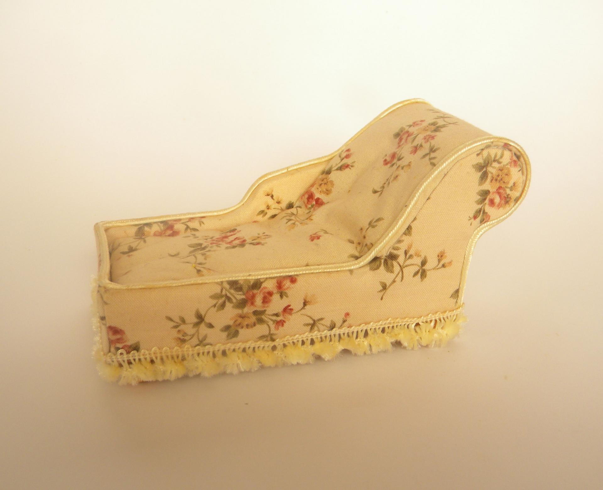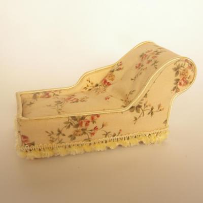 Chaise longue miniature à l'échelle 1/12° recouverte d'un tisu fleuri dans les tons de beige et vieux rose avec galon de frange de style victorien