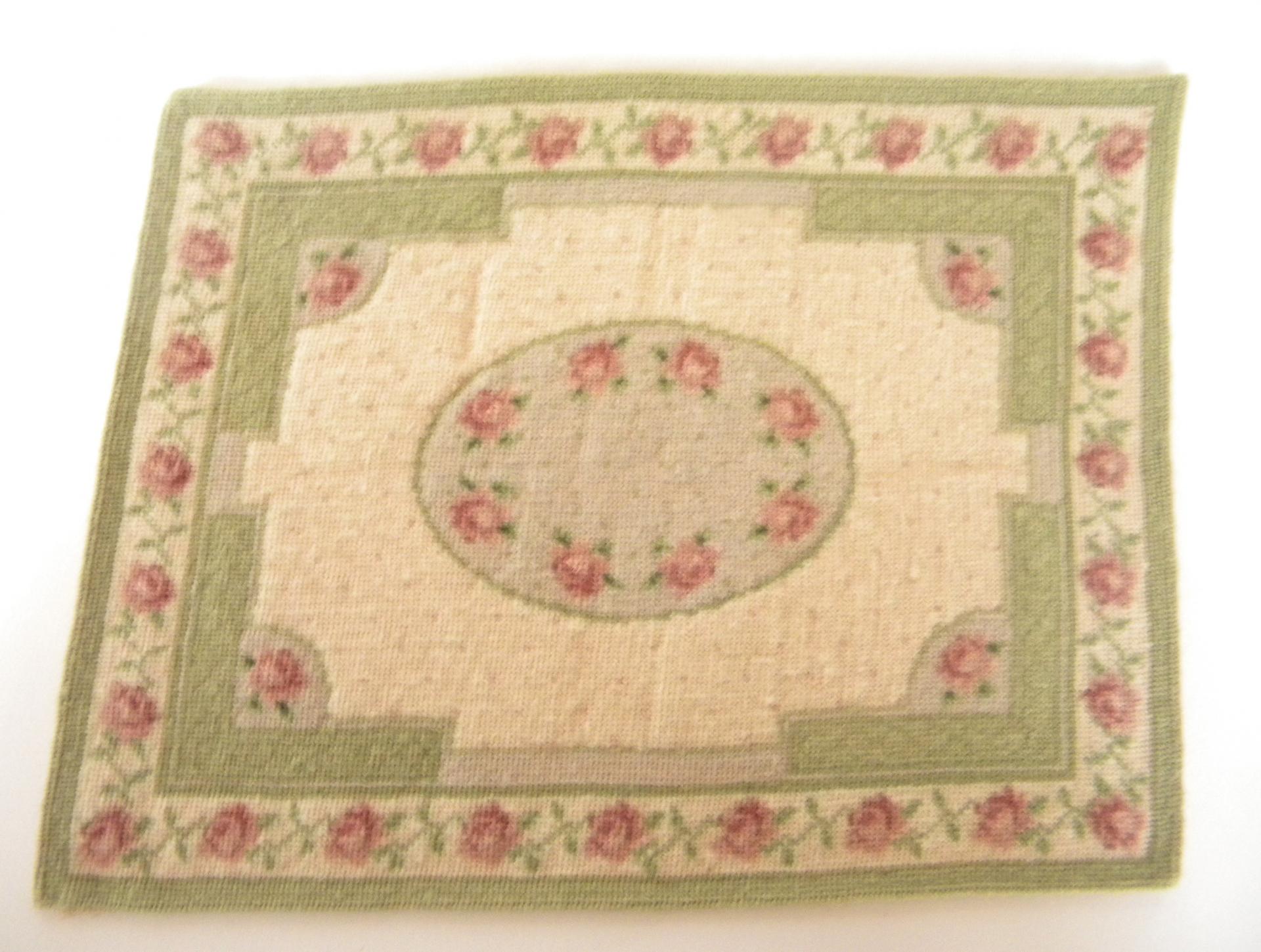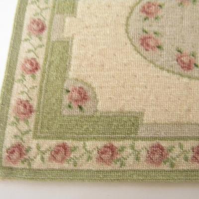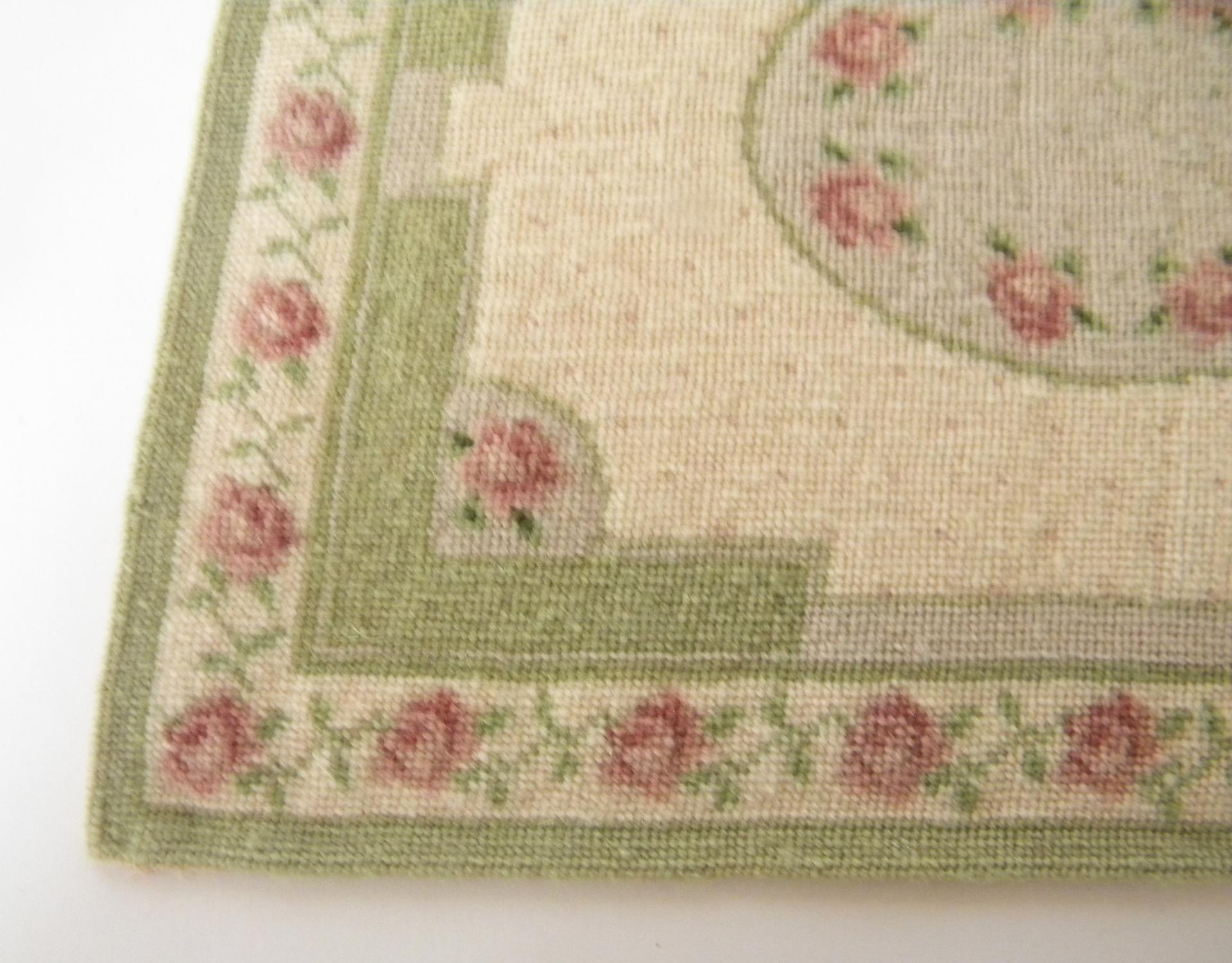 Grand tapis miniature du XIX° siècle avec de délicats motifs de roses en vert et rose sur fonds blanc