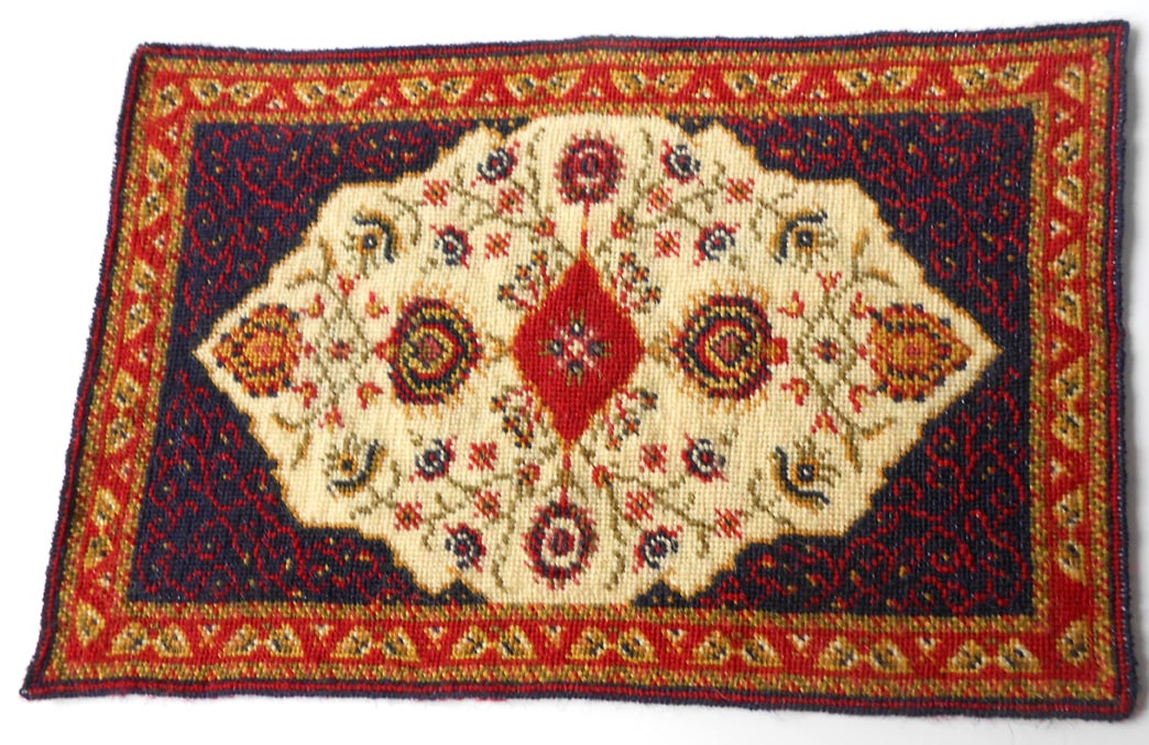 Grand tapis miniature de style Aubusson XIX° siècle à motif d'arabesque sur fonds bleu marine et grand médaillon central fonds beige