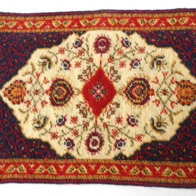 Ce tapis est réalisé entièrement à la main en laine Appleton au demi-point sur canevas unifil avec environ 10 points au cm