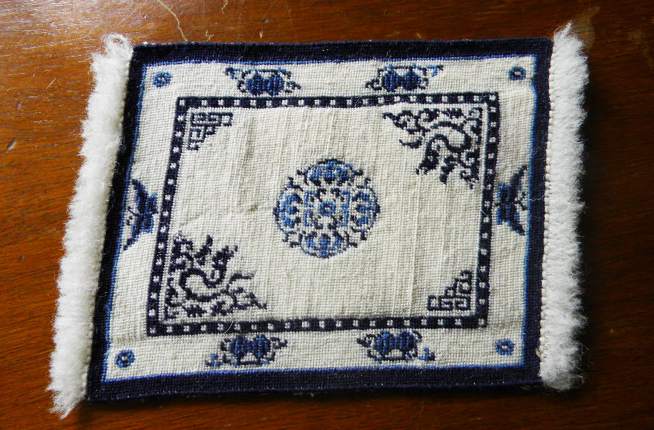 Tapis chinois au décor délicat de fleurs , papillon et dragons dans des tons de bleu sur fonds blanc