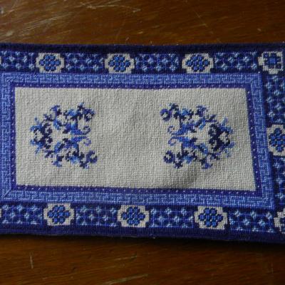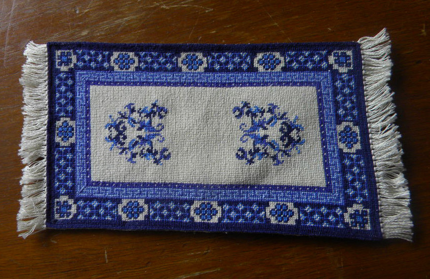 Exceptinnellement ce tapis a été réalisé sur toile avec du coton DMC avec environ 13 points au cm , les franges sont également en coton