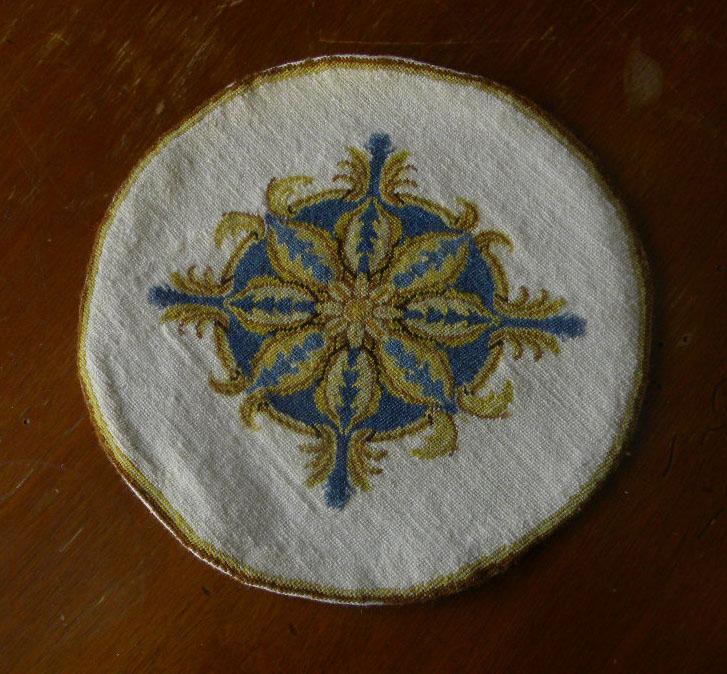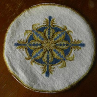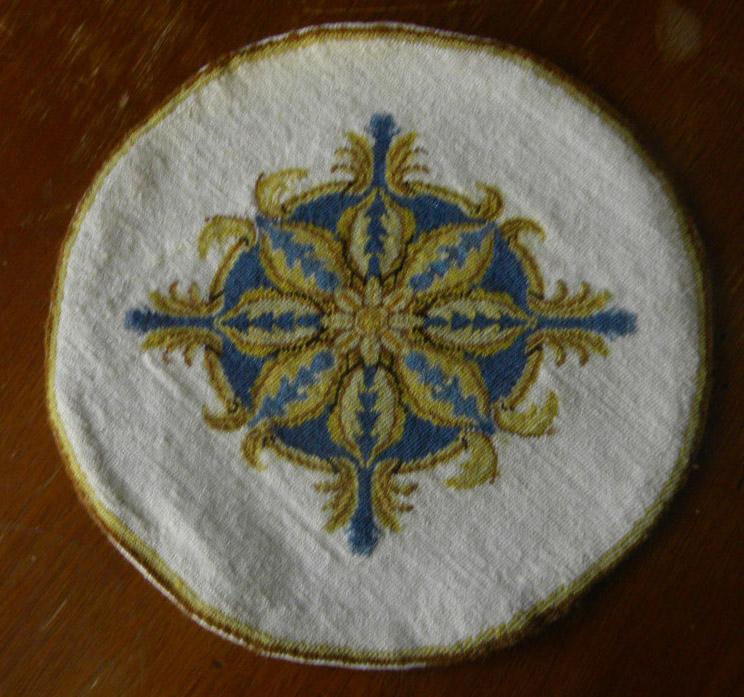 Tapis miniature rond de style XVIII° avec un grand motif central bleu et or sur fonds blanc