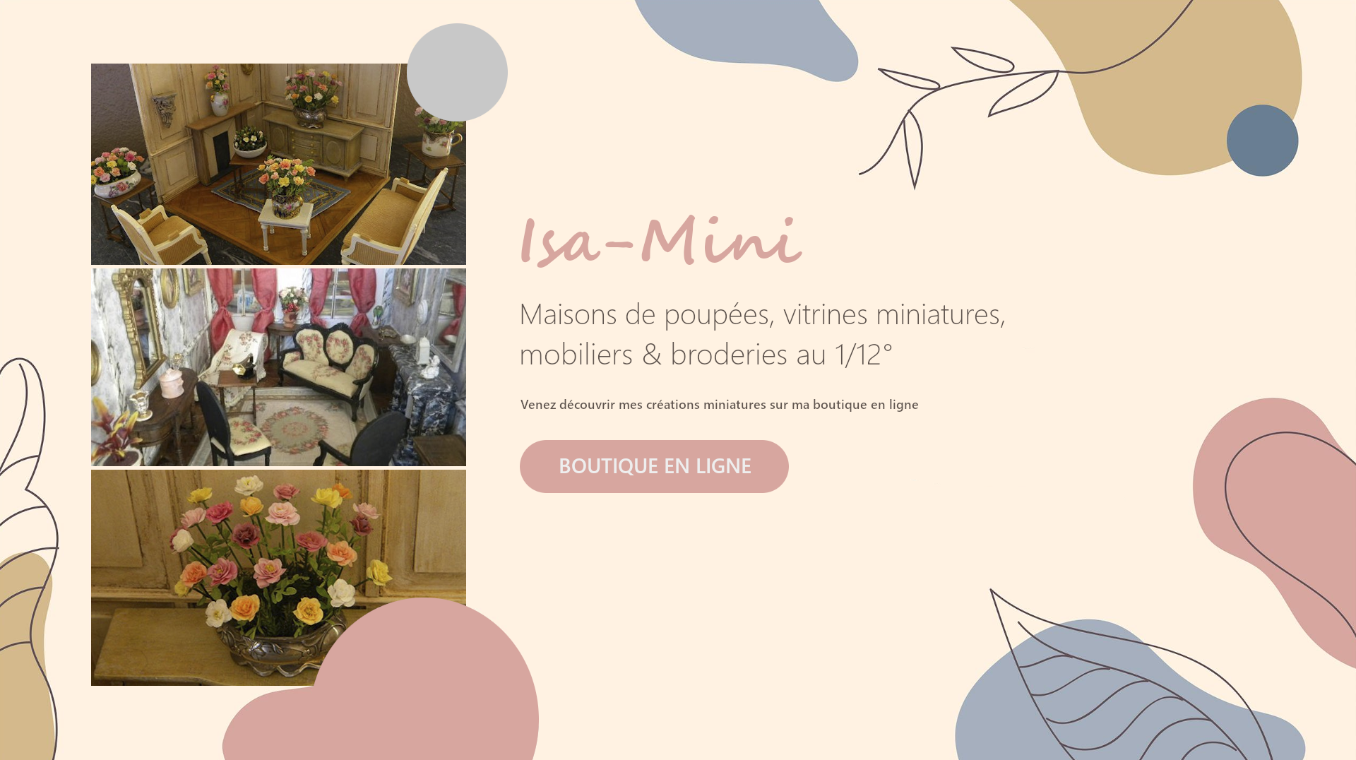 Des maisons de poupées, des vitrines miniatures, du mobilier, de la broderie, le tout au 1/12°, voilà ce que vous trouverez sur le site isa-mini. Vous trouverez également également quelques tutoriels et des imprimables que je compte étoffer (pour l'instant il n'y a que des papiers peints), n'hésitez pas à me faire part de vos besoins.