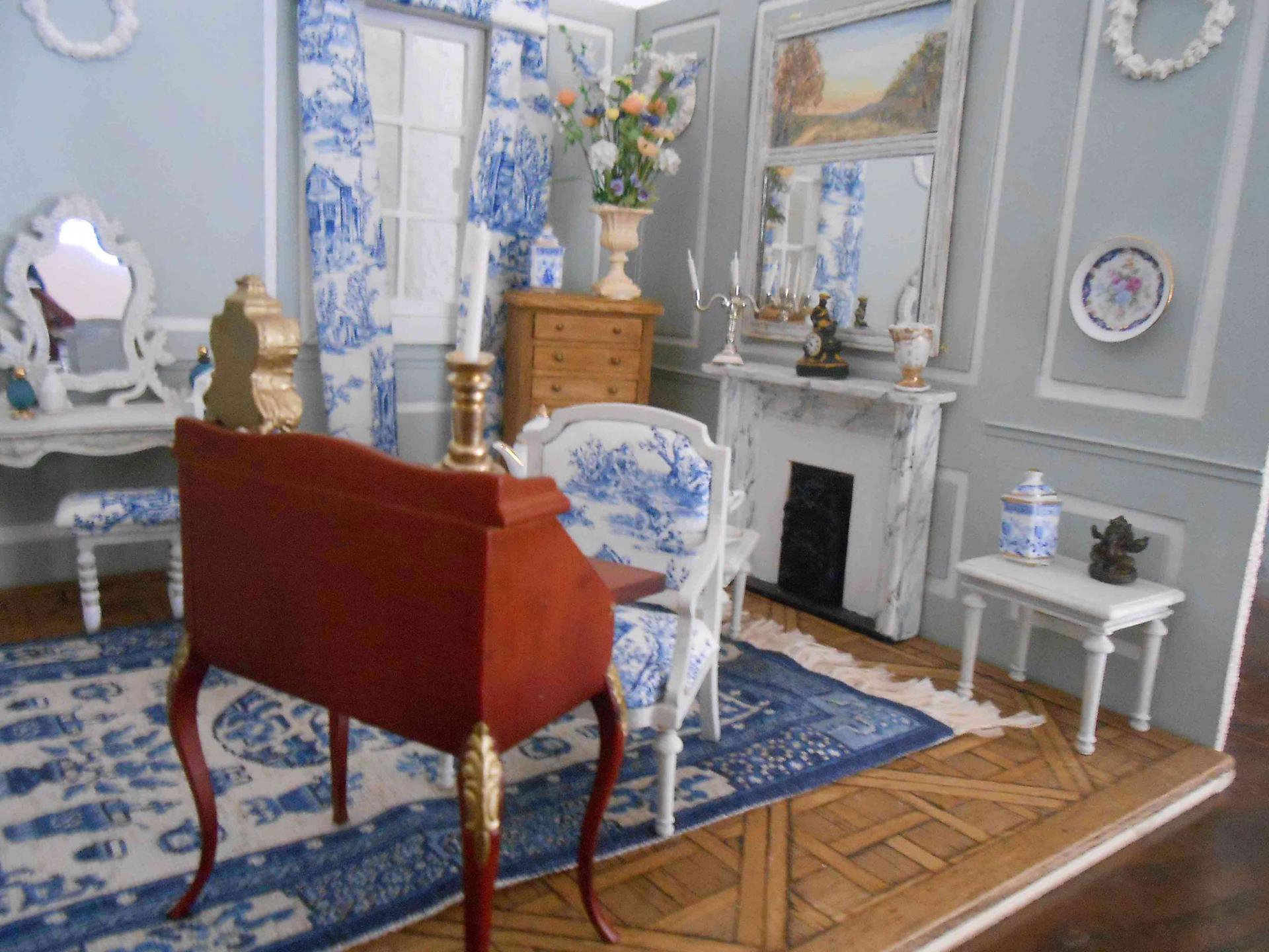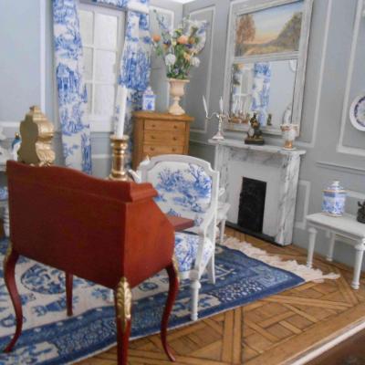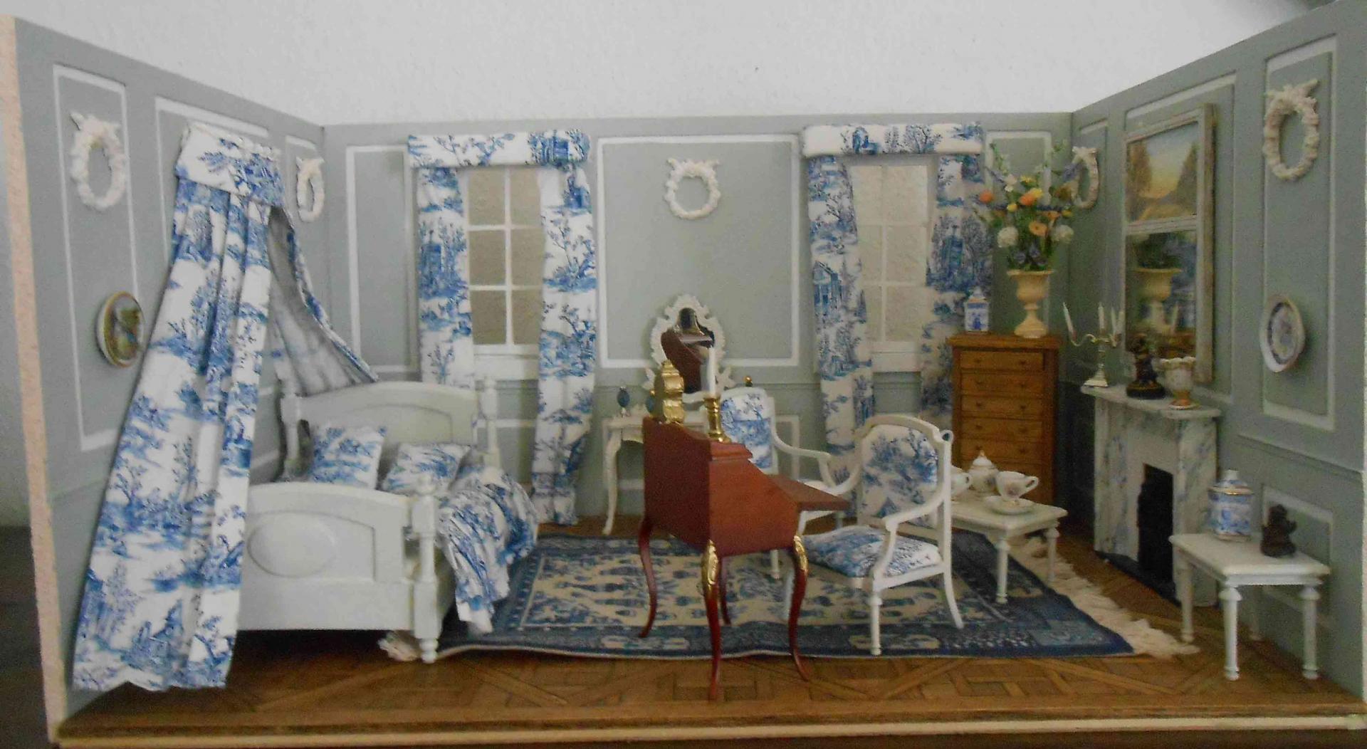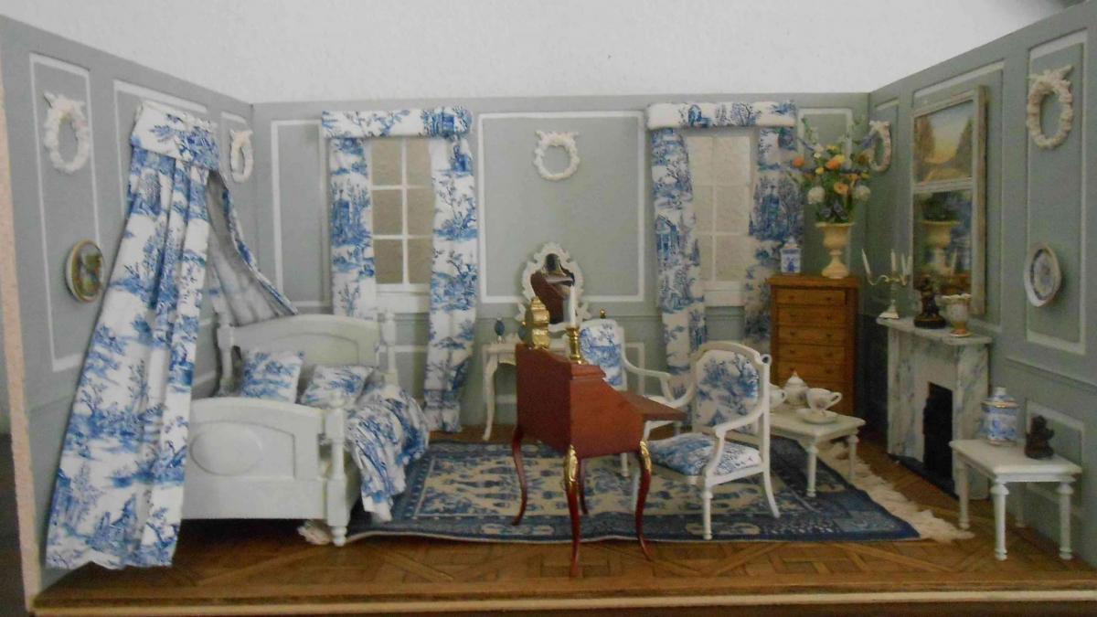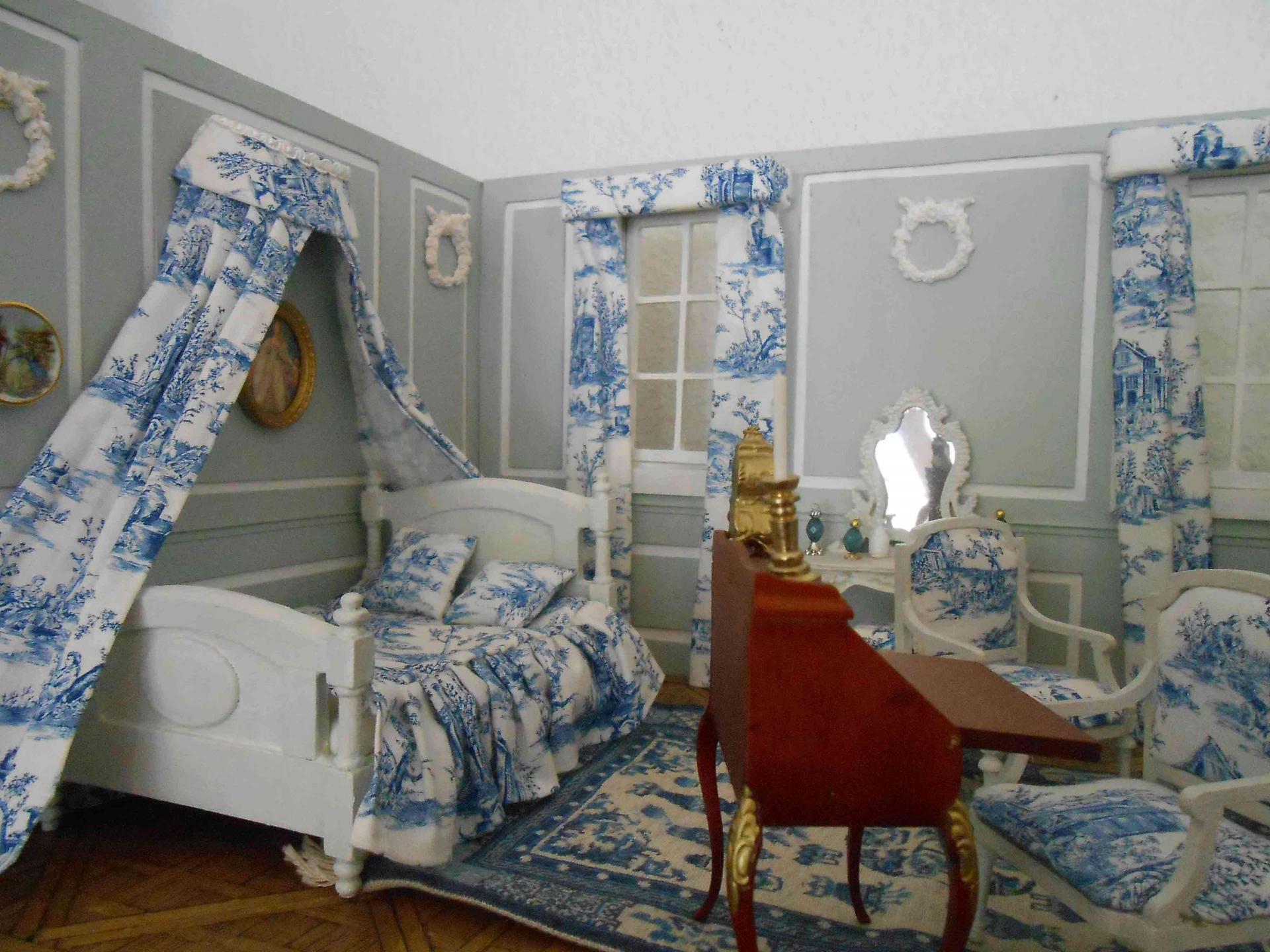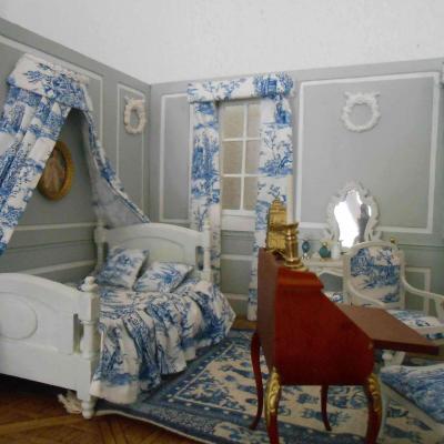 La toile de Jouy bleue qui recouvre le lit et les sièges a été choisie pour évoquer la simplicité adoptée par Marie Antoinette dans sa chambre du Petit Trianon en réaction contre les fastes de Versailles