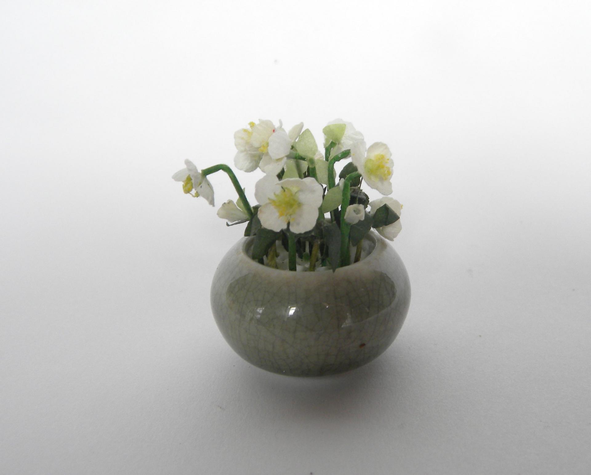 Roses de Noel blanches dans un petit vase vert céladon créé par la miniaturiste Elisabeth Causeret